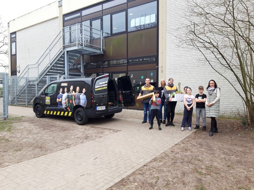 Da staunten die Kinder der OGS Thune nicht schlecht, als am letzten Schultag vor den Osterferien ein Bulli des Bau- und Gartenmarkts Hornbach vor das OGS-Gebäude vorgefahren kam. Es stiegen Frau Siegel und Herr Schukar aus, die mit Freude die Ladeluke öffneten.