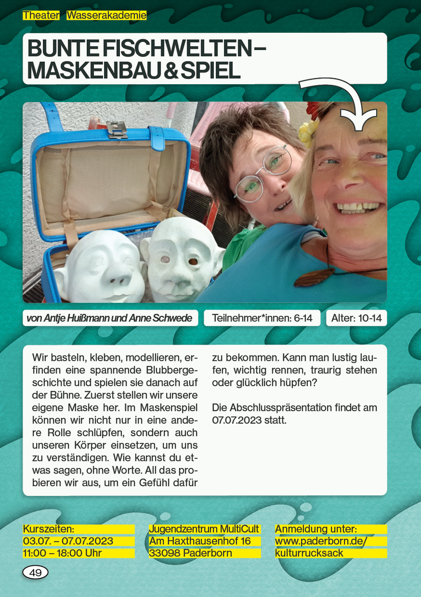 Sie befinden sich hier:StartseiteBildung UniversitätKulturelle BildungDie WasserakademieBunte Fischwelten Maskenbau & Spiel---------ausgebucht! Bunte Fischwelten Maskenbau & Spiel---------ausgebucht! Masken bauen und damit spielen! © Antje HuißmannBunte Fischwelten - Maskenbau Spiel