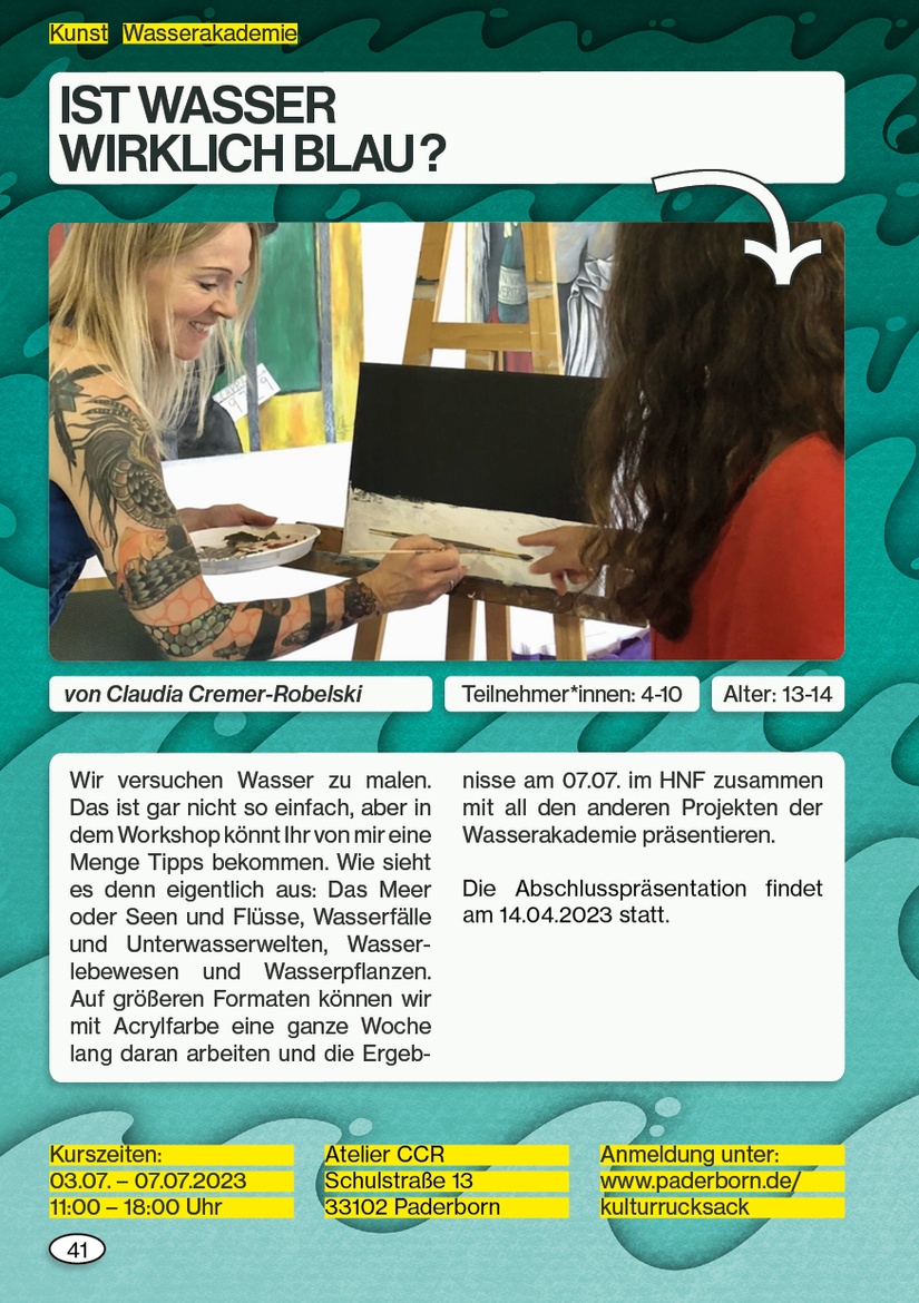 Sie befinden sich hier:StartseiteBildung UniversitätKulturelle BildungDie WasserakademieIst Wasser wirklich blau? ---------ausgebucht! Ist Wasser wirklich blau? --------ausgebucht! Auf größeren Formaten Wasser malen! © Claudia Cremer-Robelski