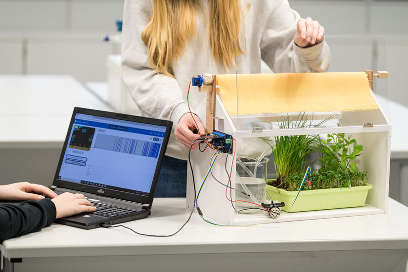 Was genau ist Wasser noch mal? Was gibt es für physikalische Phänomene? Was sagt der PH-Wert aus und warum ist Rotkohlsaft ein Indikator? Und die Kohlensäure im Mineralwasser einfangen – kein Problem. Zunächst nehmen wir Proben aus der Pader mit in das Schülerlabor und es wird getestet und gemessen. Doch damit nicht genug. Wie können wir mit Wasser möglichst sparsam umgehen, es besonders sorgfältig nutzen. Also kümmern wir uns um ein Gewächshaus und programmieren es so, dass die Beschattung automatisch gesteuert und eine Wasserpumpe automatisch die Erde befeuchtet.