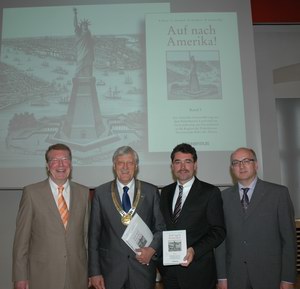 Mittwoch, 21. Mai 2008 | Stadt Paderborn - "Danke an die Herausgeber und Autoren, die so viel Arbeit in das Buch gesteckt haben." Mit dieser Anerkennung ihrer geleisteten Arbeit begrüßt Bürgermeister Heinz Paus die Herausgeber des Buches Bernd Broer, Otmar Allendorf, Heinz Marxkors und Wolfgang Stüken, sowie die Gäste des Deutsch-Amerikanischen Freundeskreises im Rathaus. Mit dem Erscheinen des Buches "Auf nach Amerika Band III" feiert der Deutsch-Amerikanische Freundeskreis Paderborn-Belleville e. V. sein 20-jähriges Bestehen. Heinz Paus lobt den größten Freundeskreis Paderborns als "sehr aktiv und anerkannt". Der Präsident des Freundeskreises Bernd Broer präsentiert das 420 Seiten umfassende Buch, das im Bonifatiusverlag erschienen ist. Es stellt Menschen aus dem Paderborner Land vor, die im 19. Jahrhundert nach Amerika ausgewandert sind. Anhand von Briefen und anderen Dokumenten wird die Geschichte ihrer Auswanderung zurückverfolgt. Ein Beispiel ist der Orden der "Schwestern der Christlichen Liebe", den Pauline von Mallinckrodt gründete. Im 19. Jahrhundert schickte sie Schwestern in die USA, die dort Niederlassungen gründeten.