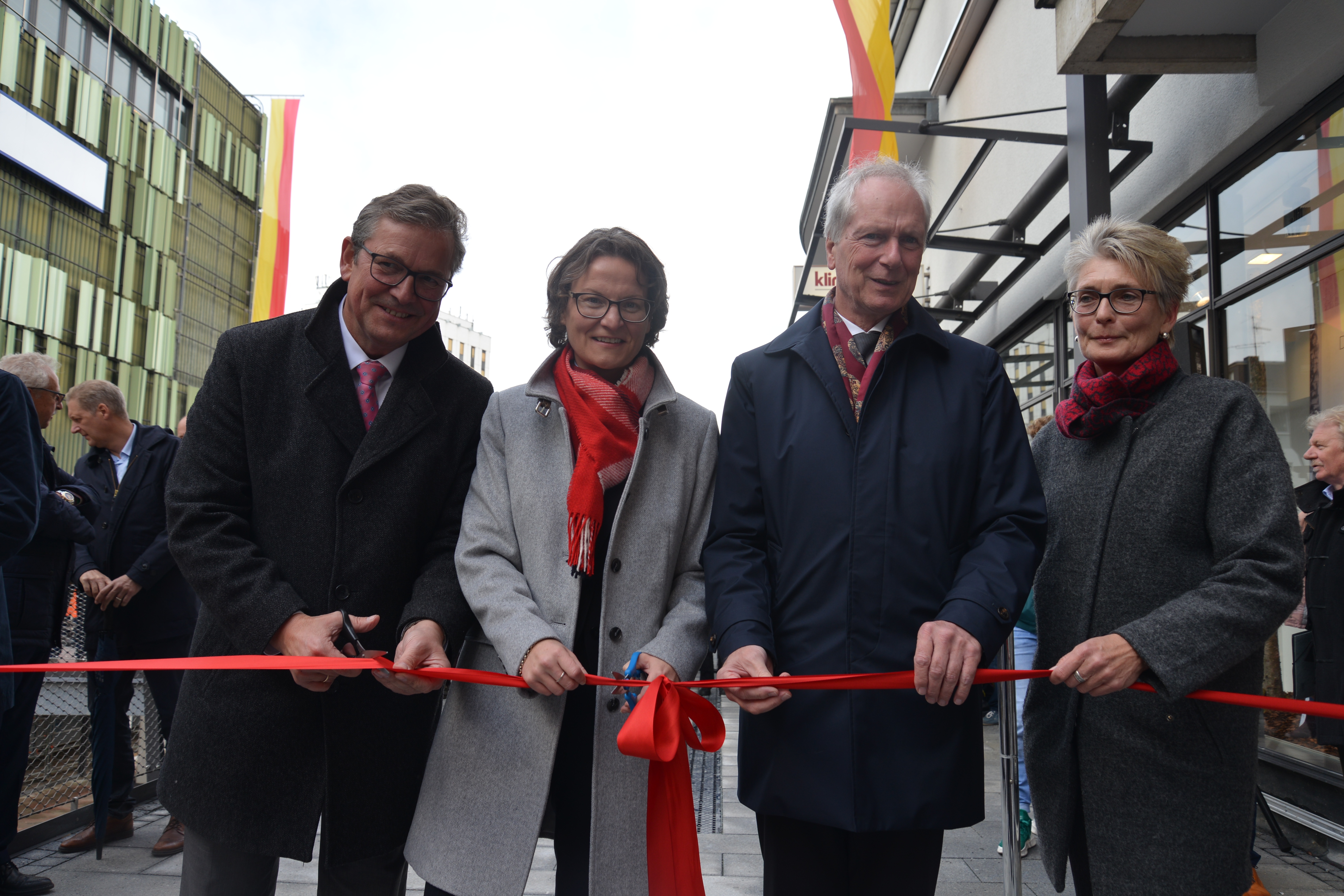 Freitag, 26. Oktober 2018 | Stadt Paderborn - Im Beisein von Bürgermeister Michael Dreier und der Technischen Beigeordneten Claudia Warnecke sowie zahlreichen geladenen Gästen und interessierten Bürgern eröffnete die Ministerin für Heimat, Kommunales, Bau und Gleichstellung des Landes Nordrhein-Westfalen Ina Scharrenbach jetzt offiziell die neuen Königsplätzen. „Sie haben jetzt eine Paderborner Kö. Seien sie stolz darauf und pflegen sie sie“, lobte Scharrenbach das Ergebnis der zweieinhalbjährigen Revitalisierung der Plätze. Feierlich durchschnitt sie zusammen mit Bürgermeister Dreier das rote Band und gab damit die großzügige Natursteintreppe entlang des Klingenthal-Gebäudes, als letzten fertiggestellten Quartierszugang frei. Diese Treppe verbindet jetzt die Königsplätze mit der Westernstraße im Bereich wo einst die sperrige Betonrampe den Blick auf die Königstraße versperrte.