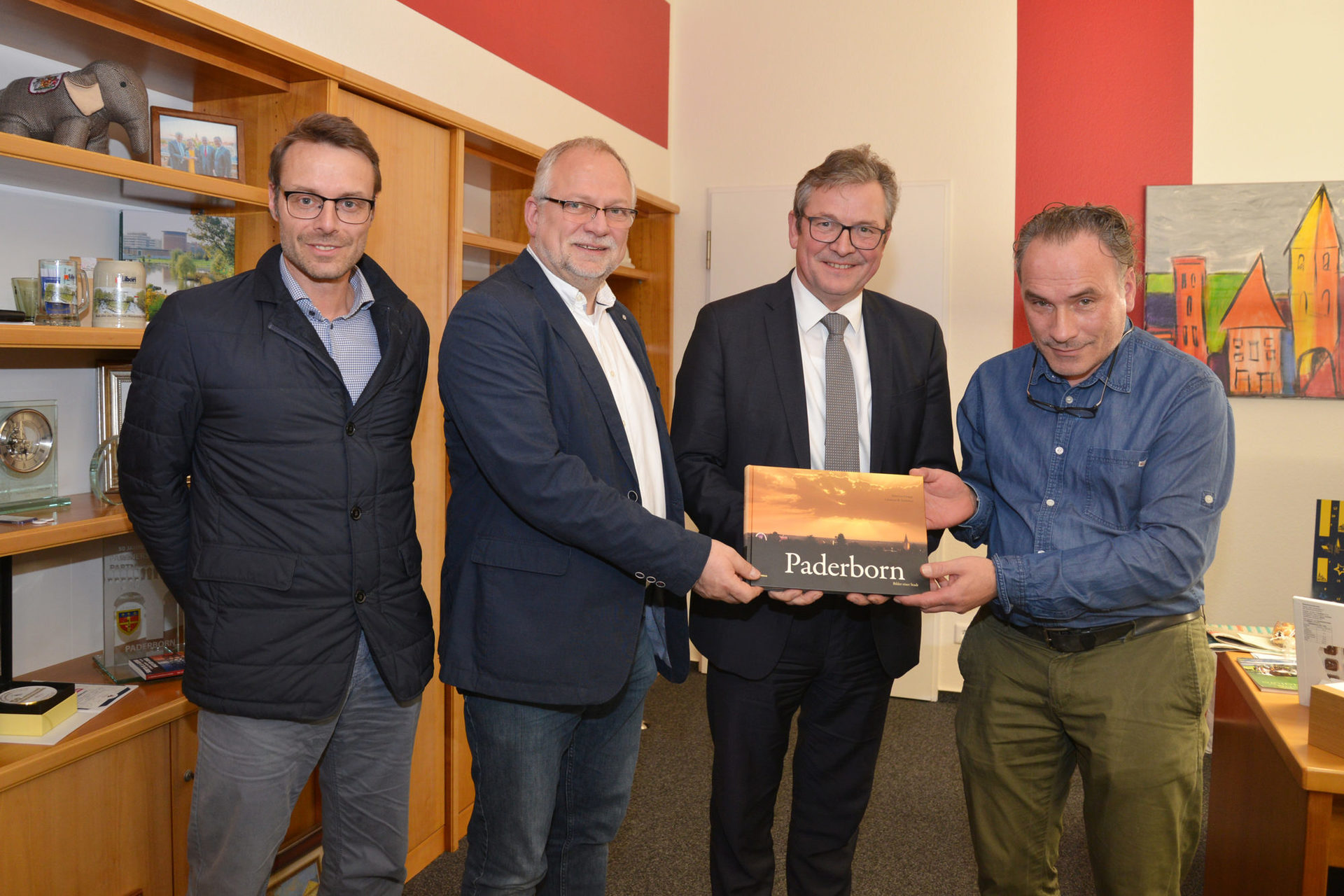 Dienstag, 03. Dezember 2019 | Stadt Paderborn - Paderborn in seiner Schönheit, seiner Vielfalt und seinen Menschen zeigt der neue Bildband „Paderborn - Bilder einer Stadt“ von Matthias Groppe und Christian R. Schlichter. Auf 160 Seiten im Querformat bietet das Fotobuch mit unbekannten Ansichten, ungewohnten Einsichten und vielen Gesichtern auch Einheimischen einen neuen Blick auf Paderborn. Anlässlich seiner Veröffentlichung haben die Autoren Bürgermeister Michael Dreier nun ein Exemplar des Bildbandes überreicht.