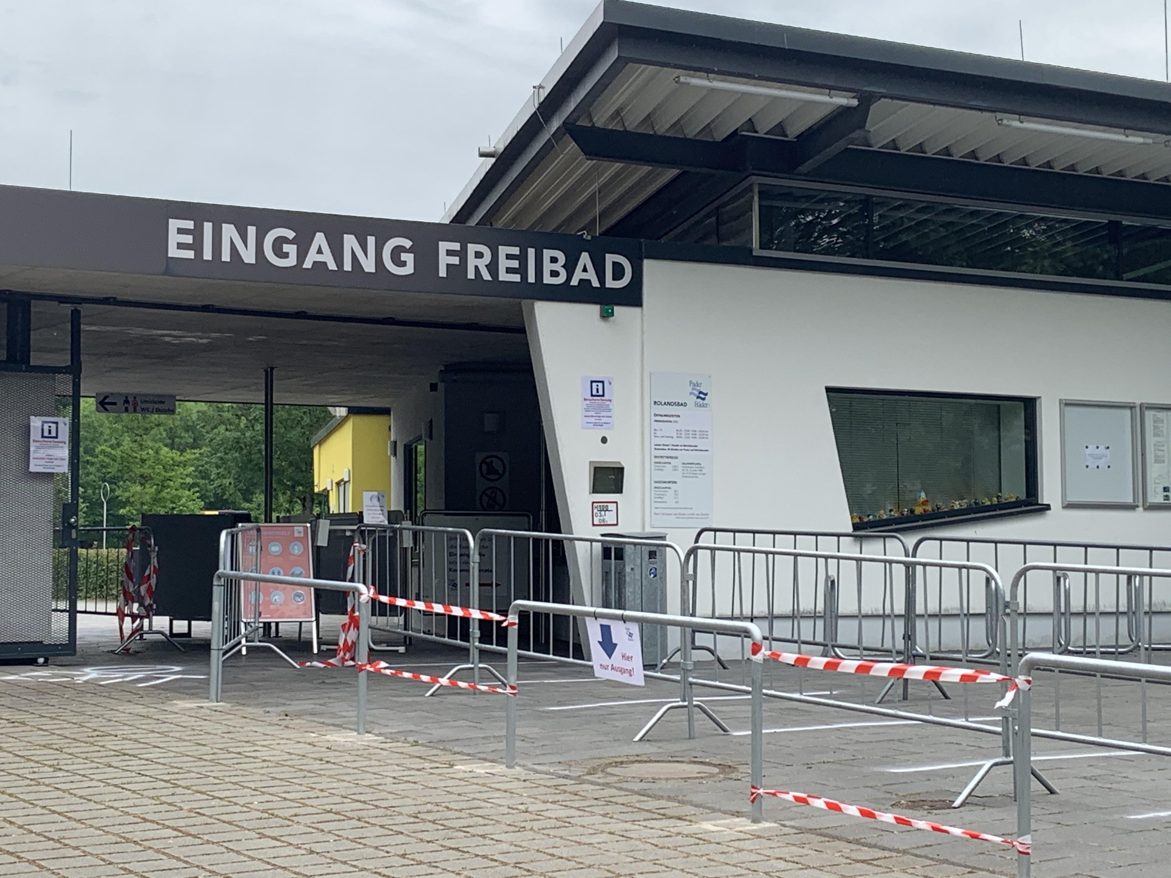 Vor dem Einlass in das Freibad werden alle Besucherinnen und Besucher auf die Hygiene- und Einlassvorschriften des Bads hingewiesen. Diese bestehen aus geänderten Öffnungszeiten, die täglich zwei Öffnungszeitenblöcke mit Reinigungs- und Desinfektionspausen umfassen.