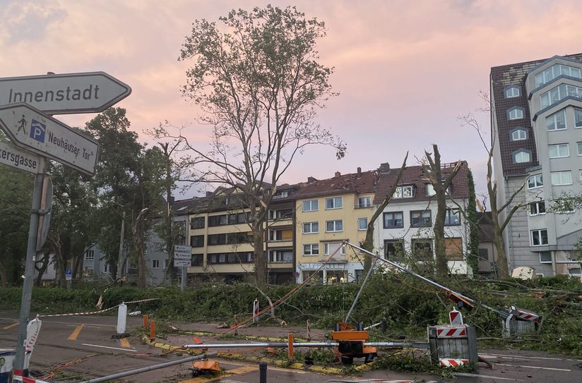 Samstag, 21. Mai 2022 | Stadt Paderborn - Ein Tornado hat am Freitagabend Paderborn durchquert und eine Schneise der Verwüstung hinterlassen. Vom Südwesten zog er in Richtung Nordosten auf einer Breite von etwa 300 Metern über die Stadt. Bäume wurden entwurzelt, Dächer abgedeckt, Fahrzeuge kippten um. 43 Personen wurden verletzt, 13 davon schwer. Eine Schwerstverletzte wurde in eine Spezialklinik nach Bielefeld verlegt. Mehr als 400 Einsatzkräfte führten über 200 Einsätze durch. Für den Nachmittag haben sich NRW-Ministerpräsident Hendrik Wüst und NRW-Innenminister Herbert Reul angekündigt.