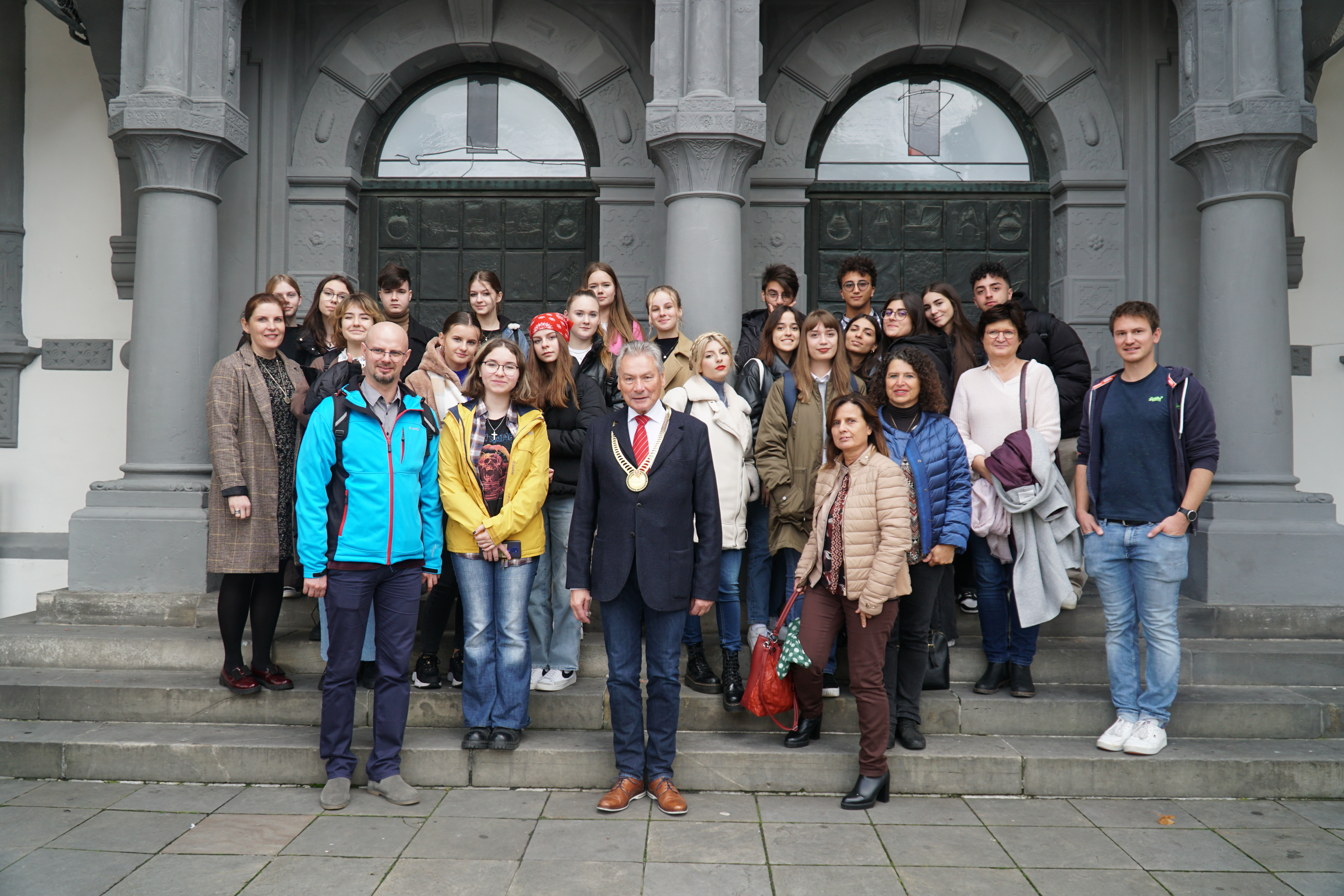 Montag, 24. Oktober 2022 | Stadt Paderborn - Am Montagvormittag, 24. Oktober, begrüßte der stellvertretende Bürgermeister Dietrich Honervogt eine 20-köpfige Schülergruppe aus der polnischen Stadt Wagrowiec und der italienischen Stadt Catanzaro im historischen Rathaus in Paderborn. Begleitet wurden die Schülergruppen von jeweils zwei Lehrkräften aus deren Heimat und den beiden Erasmus Plus Organisatoren und Lehrer*innen des Gymnasiums St. Michael, Marielis Klösener-Voß, als Lehrkraft für Sport, Geschichte und Politik sowie dem Englischlehrer, Julian Leimann, der auch als Dolmetscher für die beiden Schulklassen fungierte.