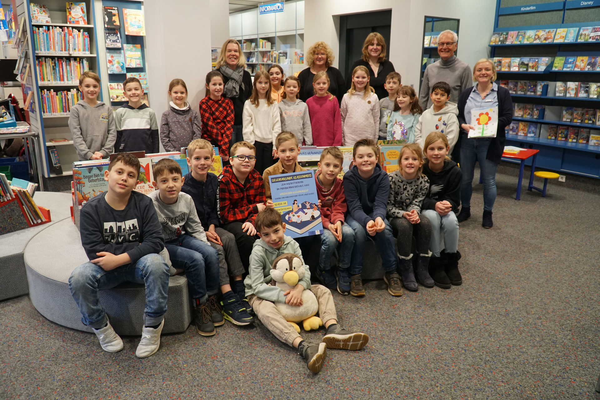 Mittwoch, 18. Januar 2023 | Stadt Paderborn - Bis in den Januar hinein zierten alle eingesendeten Bilder zum Adventskalender am Paderborner Rathaus die Kinderbibliothek Paderborn. Anna Driller, Leiterin der Kinderbibliothek und ihr Team haben beim Aufhängen der über 1.100 Bilder einer ganz besonderen Klasse einen ebenso besonderen Platz gewidmet: Direkt über dem Eingangsbereich hängen die 22 Bilder der 3 a der Dionysiusschule aus Elsen. Denn diese wurde im vergangenen Dezember im Rahmen des Adventskalenders am Rathaus als Klasse mit der besten Klassenleistung ausgewählt. Die Siegerehrung zum Klassenpreis fand am vergangenen Freitag in der Kinderbibliothek Paderborn statt. Eingeladen waren alle 22 Gewinner-Kinder sowie zwei Lehrkräfte.