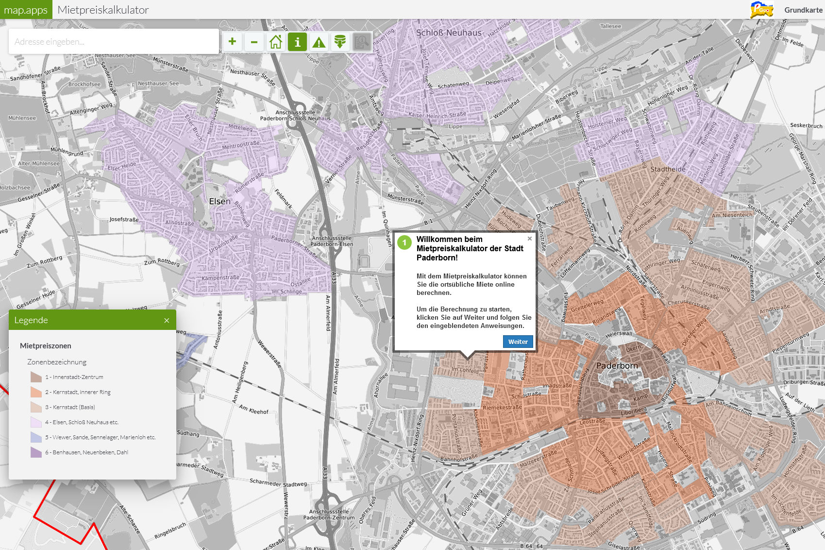 Auch der seit einigen Jahren etablierte Mietpreiskalkulator, mit dem die ortsübliche Vergleichsmiete für eine konkrete Wohnung komfortabel ermittelt werden kann, wurde weiterentwickelt. Die Nutzer*innen werden Schritt für Schritt durch die Online-Anwendung geführt: Nach Eingabe der Wohnungsanschrift wird das zugehörige Gebäude kartenbasiert ausgewählt. Mit weiteren spezifischen Angaben zur Wohnung wie Größe, Ausstattung, Beschaffenheit etc. wird schließlich die ortsübliche Vergleichsmiete für die Wohnung ermittelt. Der Mitpreiskalkulator steht unter unter www.paderborn.de/ > Wohnen Soziales > Bauen & Wohnen > Wohnen > Mietspiegel und Mietpreiskalkulator zur Verfügung.