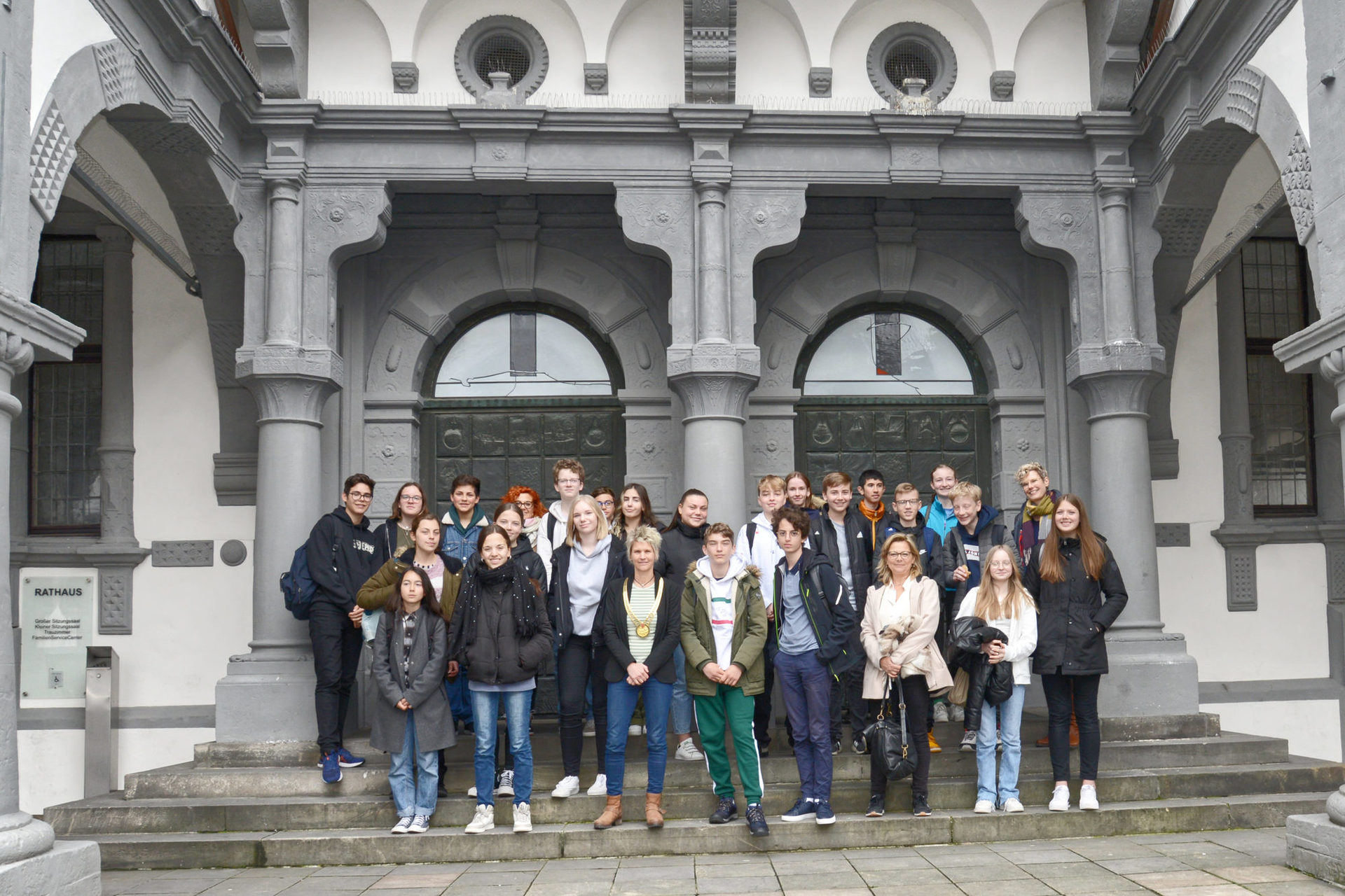 Donnerstag, 23. März 2023 | Stadt Paderborn - Am Donnerstagmorgen, 23. März, begrüßte die stellvertretende Bürgermeisterin Sabine Kramm eine 12-köpfige Schülergruppe aus der Gegend von Nizza und ihre deutschen Austauschpartner*innen im historischen Rathaus. Begleitet wurden sie von Frau Niemann vom Gymnasium St. Michael und den französischen Lehrerinnen Frau Bout und Frau Ghibaut.