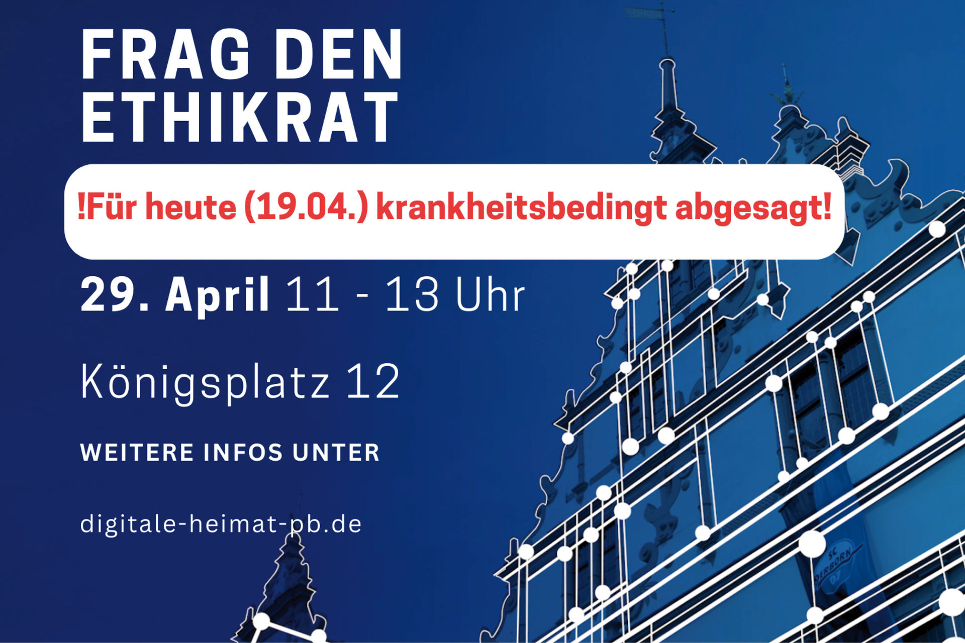 Machen digitale Technologien zukünftig meine Arbeit überflüssig? Ist Künstliche Intelligenz klüger als ich? Wie kontrollieren wir die Technik? Zu diesen und anderen Fragen rund um das Thema Ethik und Digitalisierung können interessierte Bürger*innen am Mittwoch, den 19. April, 17-19 Uhr und am Samstag, den 29. April, 11-13 Uhr, in den Räumlichkeiten der Digitalen Heimat PB am Königsplatz 12 mit dem Ethikrat ins Gespräch kommen.