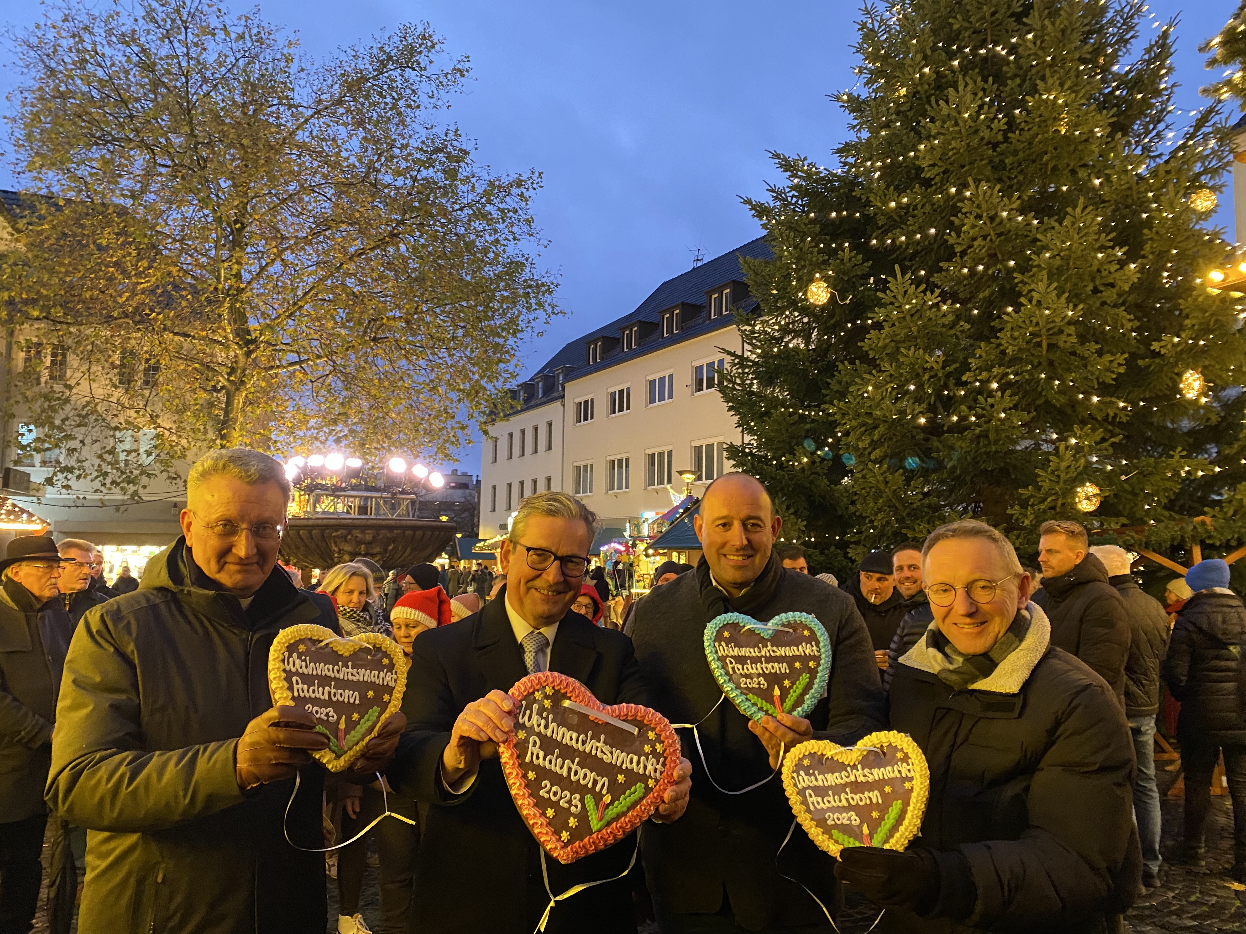Freitag, 24. November 2023 | Stadt Paderborn - Der Regen hatte aufgehört, die Lebkuchenherzen ließen am Paderborner Rathaus die Kinderherzen höher schlagen und die Bläsergruppe der Städtischen Musikschule hatte die passenden gemafreien Weihnachtslieder parat: Mehr Vorfreude auf dem vom Paderborner Stadtmarketing veranstalteten Weihnachtsmarkt ging nicht! Als Bürgermeister Michael Dreier dann noch auf die vielen Angebote des 80 Stände umfassenden Weihnachtsmarktes zwischen Westerntor und Markt- und Domplatz zu sprechen kam, war klar, dass auch in diesem Jahr die Besucherinnen und Besucher einiges erwartet.