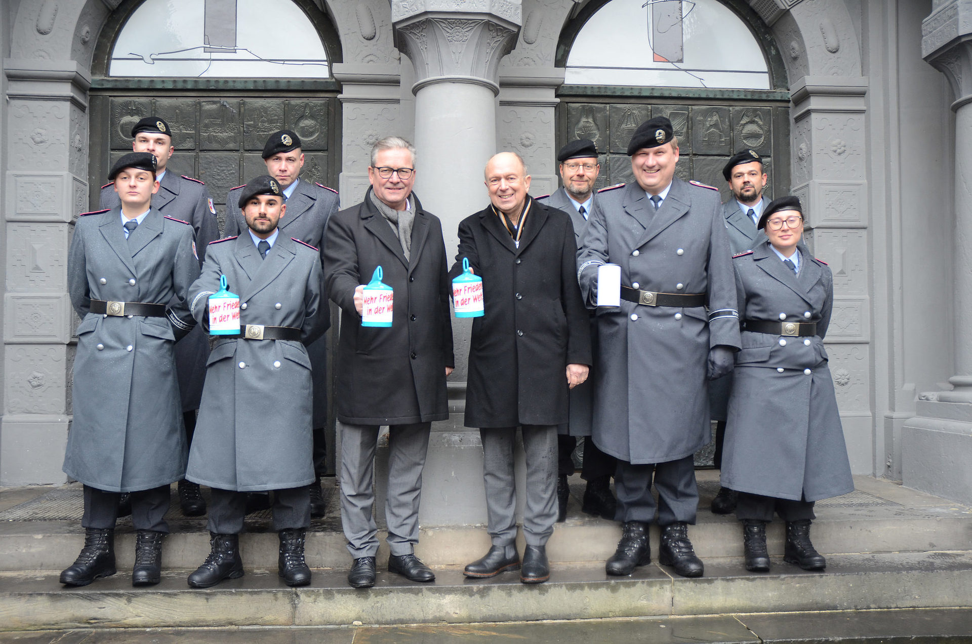 Dienstag, 28. November 2023 | Stadt Paderborn - Seit dem 15. Oktober und noch bis zum 30. November läuft in Deutschland die Haus- und Straßensammlung des Volksbundes Deutsche Kriegsgräberfürsorge. Auch im Landesverband NRW engagieren sich zahlreiche ehrenamtliche Sammler*innen und bitten die Bevölkerung um Spenden für den Erhalt der Kriegsgräber beider Weltkriege und die historisch-politische Bildungsarbeit des Volksbundes. In Paderborn erhielten Soldatinnen und Soldaten des Panzerbataillons 203 aus Augustdorf am Montag tatkräftige Unterstützung: Landrat Christoph Rüther und Bürgermeister Michael Dreier halfen beim Sammeln.