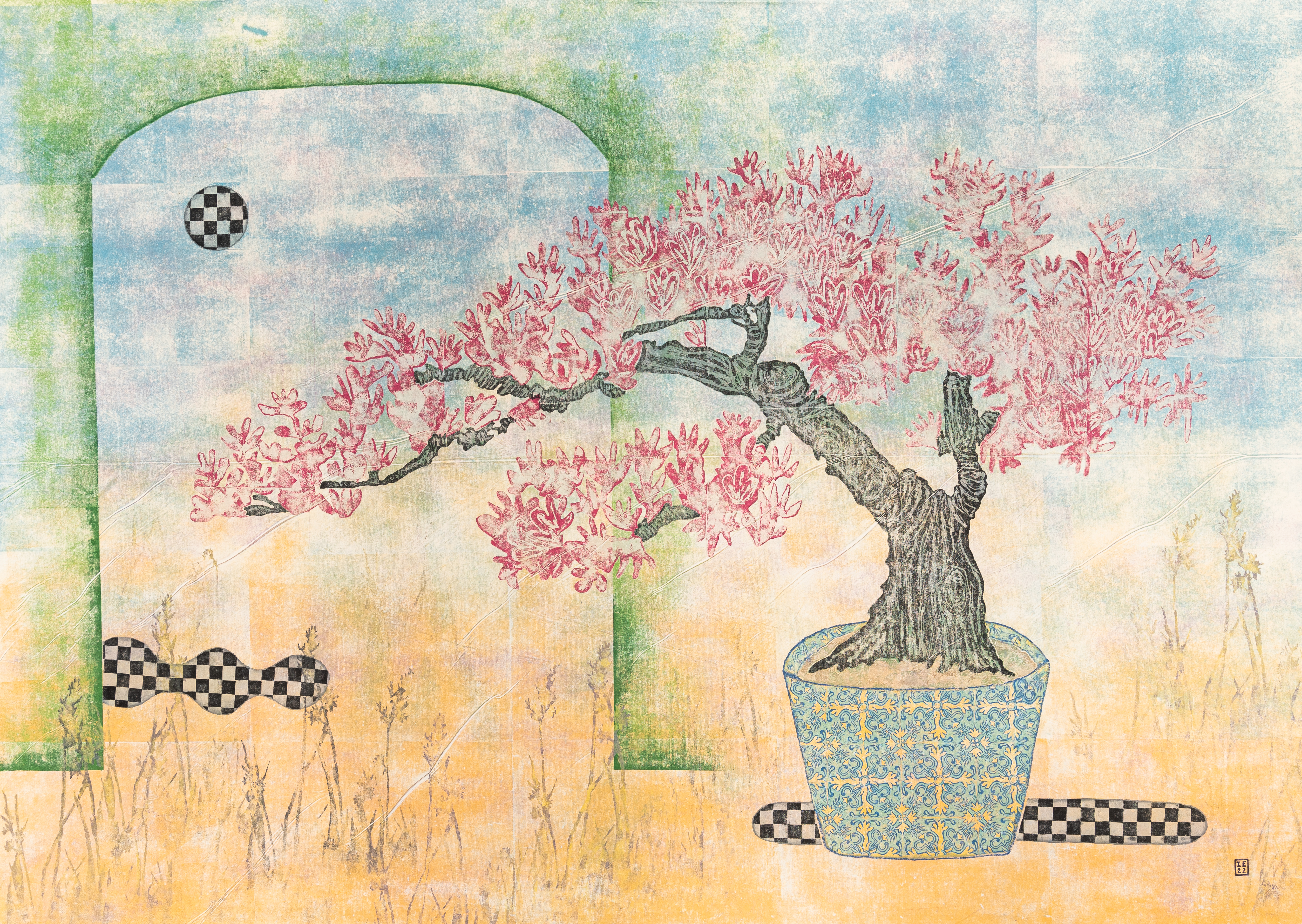 Wie Malerei wirken auch die Werke von Inessa Emmer (*1986). Doch diese entstehen komplett im Holzschnitt-Verfahren. Sie baut den Hintergrund ihrer Arbeiten aus rechteckigen Pappelholzplatten auf, die nebeneinander gedruckt einen geometrisierenden Rhythmus ergeben. In weiteren Schritten überträgt sie mit dem Druck und den Bewegungen ihres Körpers ausgeschnittene Elemente auf den Nesselstoff. So baut sie einen poetischen Bildraum aus realen und surrealen Dingen, der durch die Vielschichtigkeit der Farbe räumliche Tiefe gewinnt.
