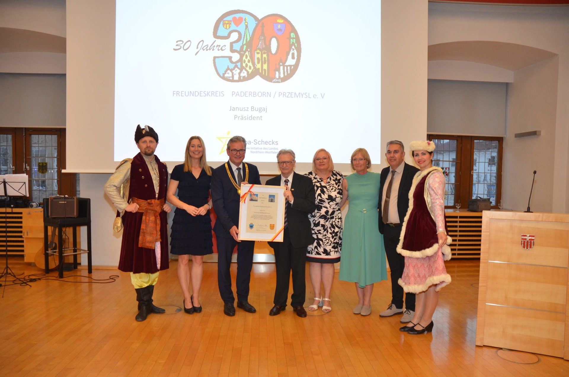 Anlässlich des 30. Vereinsjubiläums folgten der Einladung des Freundeskreises am vergangenen Freitag Mitglieder, Freunde und politische Vertreterinnen und Vertreter zu einer Feierstunde in den großen Saal des historischen Rathauses. Begleitet wurde das Festprogramm von den Musikern Matthias Lüke und Tim Rustemeier, einer Kunst-Ausstellung mit Bildern von Künstlern aus Przemysl sowie der Präsentation traditioneller polnischer Trachten durch das Ehepaar Magdalena und Piotr Joop.