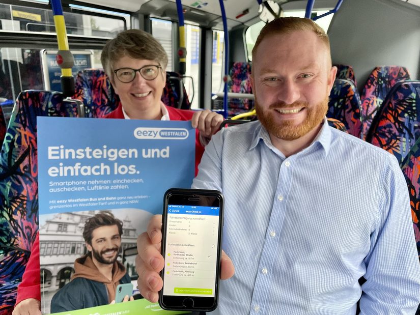 Mit dem elektronischen NRW-Tarif ”eezy” kann man landesweit in Bussen und Bahnen ohne Tarifkenntnisse unterwegs sein. Der Preis wird automatisch berechnet – nicht nach dem tatsächlichen Fahrtweg, sondern nach den gefahrenen Luftlinienkilometern zwischen Start- und Zielhaltestelle. Um noch mehr Fahrgäste für sich zu begeistern, bietet ”eezy Westfalen” aus Anlass des diesjährigen NRW-Tags in Köln eine zweitägige Mitnahmeaktion an, bei der zwei zum Preis von einer Person fahren können. Auch beim PaderSprinter ist ”eezy Westfalen” über die Fahrplan-App buchbar.