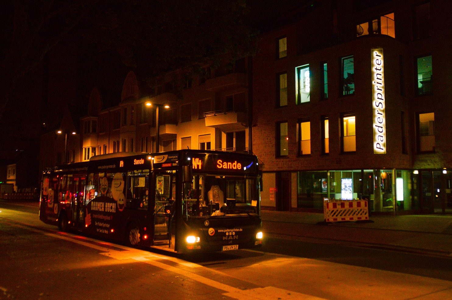 Immer in den Nächten von Freitag auf Samstag und von Samstag auf Sonntag, aber eben auch vor Feiertagen, sorgt der PaderSprinter mit vier Nachtbus-Linien für einen bequemen und sicheren Heimweg zwischen der Paderborner Innenstadt und den Stadtteilen. Dabei starten die N1 (Sennelager – Schloß Neuhaus – Auf der Lieth - Kaukenberg), N2 (Wewer - Marienloh), N4 (Sande – Elsen - Dahl) und N8 (Gesseln – Elsen – Benhausen - Neuenbeken) zwischen 0:30 Uhr und 01:30 Uhr am ZOH ”Westerntor”. Als weiterer Innenstadthalt steht den Fahrgästen für die Nachtbusse ebenfalls ”Am Bogen” zur Verfügung. Die Fahrten werden auch über die Fahrplan-App und die elektronische Fahrplanauskunft ausgegeben.