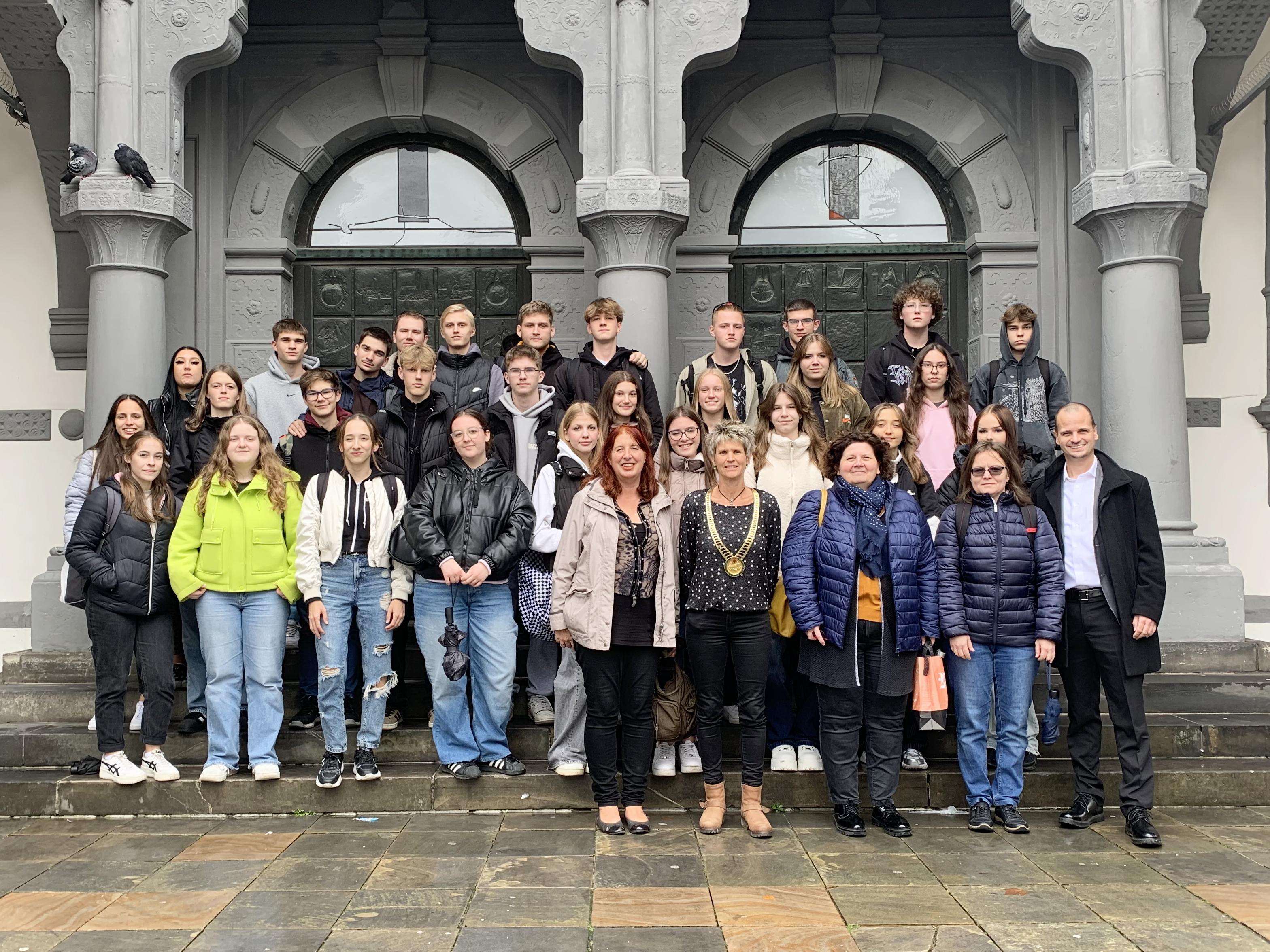 Donnerstag, 10. Oktober 2024 | Stadt Paderborn - Am Donnerstag begrüßte die stellvertretende Bürgermeisterin Sabine Kramm eine ungarische Schülergruppe gemeinsam mit ihren Austauschpartner*innen und Lehrkräften im großen Sitzungssaal des historischen Rathauses. Die Schülergruppe aus Debrecen besucht derzeit seine Partnerschule, das Gymnasium Schloß Neuhaus.