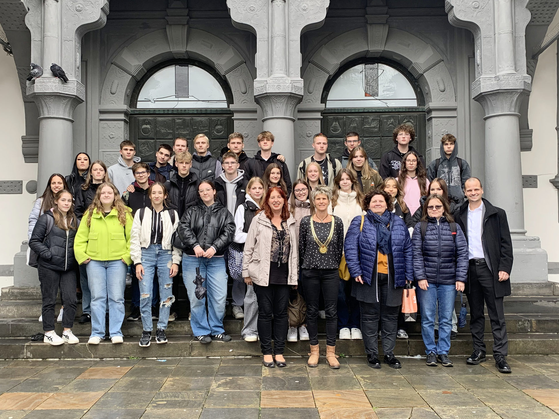 Im Rahmen des Empfangs stellte Sabine Kramm den Schüler*innen interessante Fakten und aktuelle Themen der Stadt vor. Anschließend kam die Gruppe in einer Fragerunde mit der stellvertretenden Bürgermeisterin ins Gespräch. Neben dem Termin im Rathaus gehören unter anderem ein Besuch des Heinz Nixdorf MuseumsForums und eine Stadtführung, die von den Schüler*innen selbst organisiert wurde, zum Programm in Paderborn, bevor die Gäste am Freitag die Heimreise antreten.