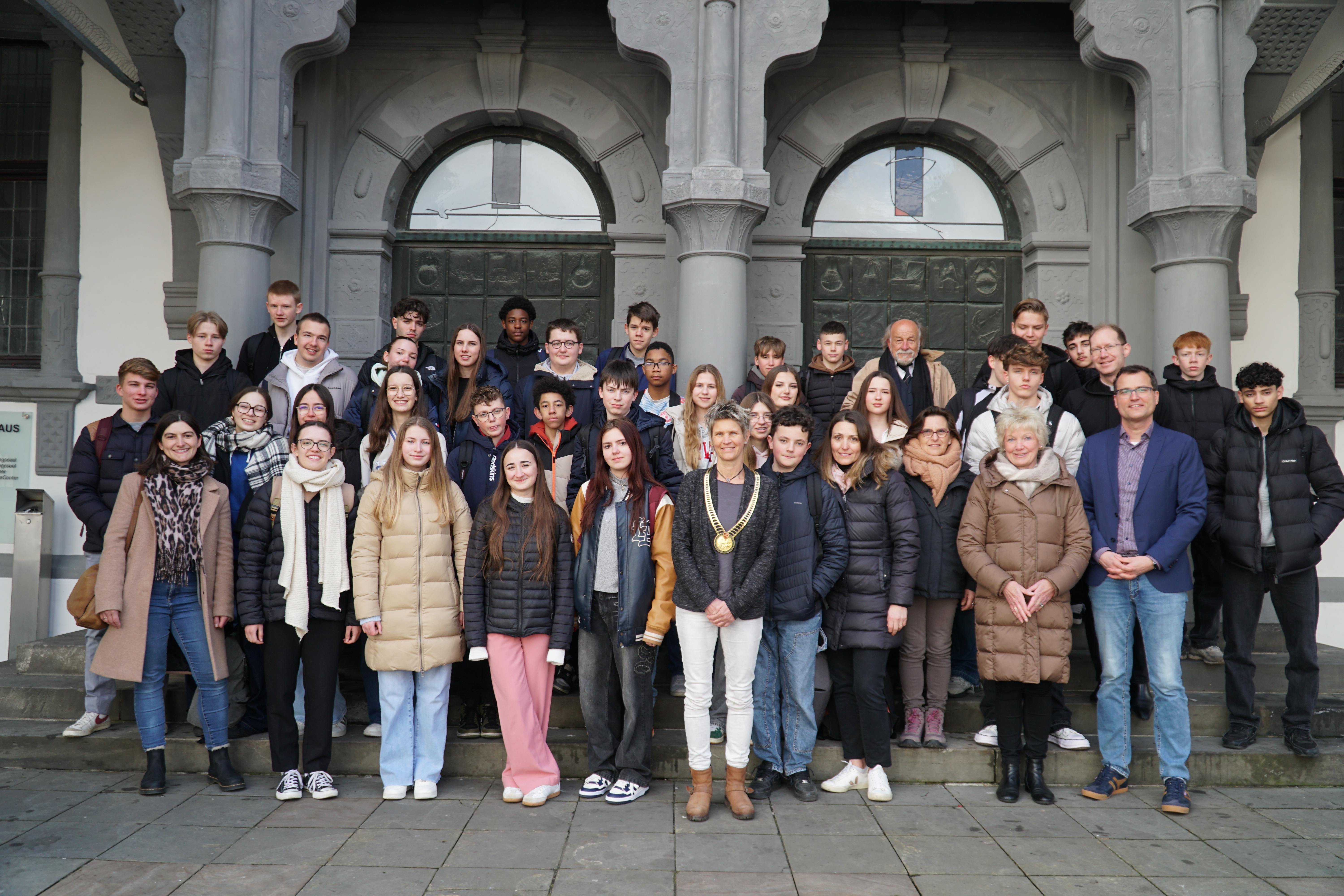 Begrüßt wurde die Gruppe von der stellvertretenden Bürgermeisterin Sabine Kramm, die die Schülerinnen und Schüler, als Zeichen der besonderen Wertschätzung, auf Französisch empfing. Begleitet wurde der Besuch von Birgit Kelliger von der Deutsch-Französischen Gesellschaft sowie den Lehrkräften Kristin Zimmermann, Jost Biermann, als stellvertretender Schulleiter und Wilhelm Groppe. Auch Vertreter der französischen Schule waren dabei: Andrea Ritzmann, Odile Echevard und Seelsorger Marc Isnard begleiteten den Schüleraustausch.