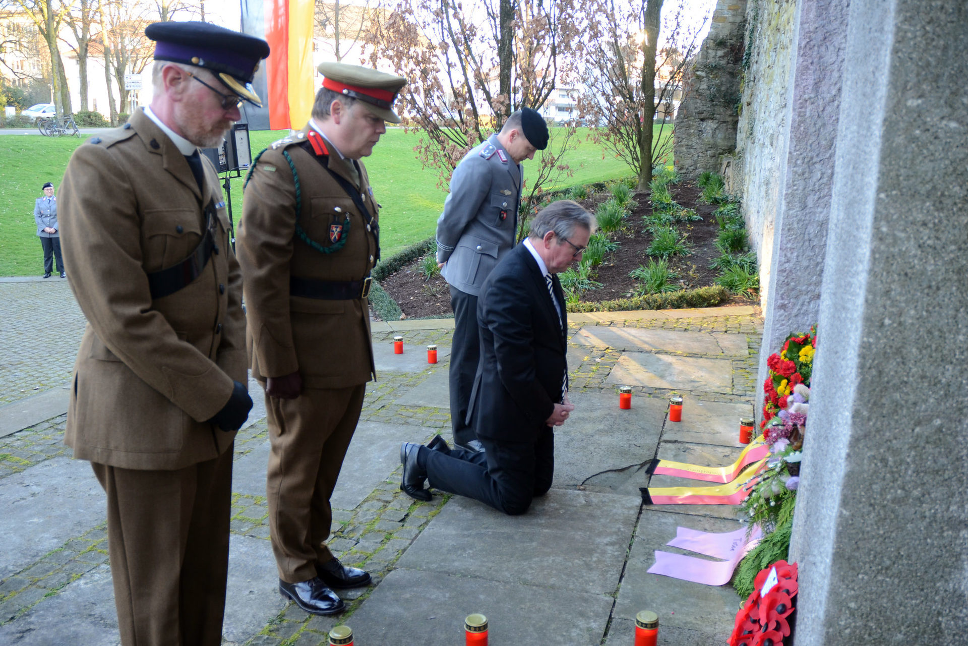 Im Anschluss an die Beiträge, für die sich Michael Dreier herzlich bedankte, legte neben dem Paderborner Bürgermeister auch Oberstleutnant Oliver Kaufmann von der Bundeswehr sowie Colonel Mike Foster-Brown von den britischen Streitkräften einen Kranz am Mahnmal nieder. Musikalisch begleitet wurde die Gedenkveranstaltung vom Bläserkreis der Städtischen Musikschule Paderborn, dem Dreier ebenso seinen Dank aussprach wie den beiden städtischen Kranzträgern Till Willeke und David Klassen.