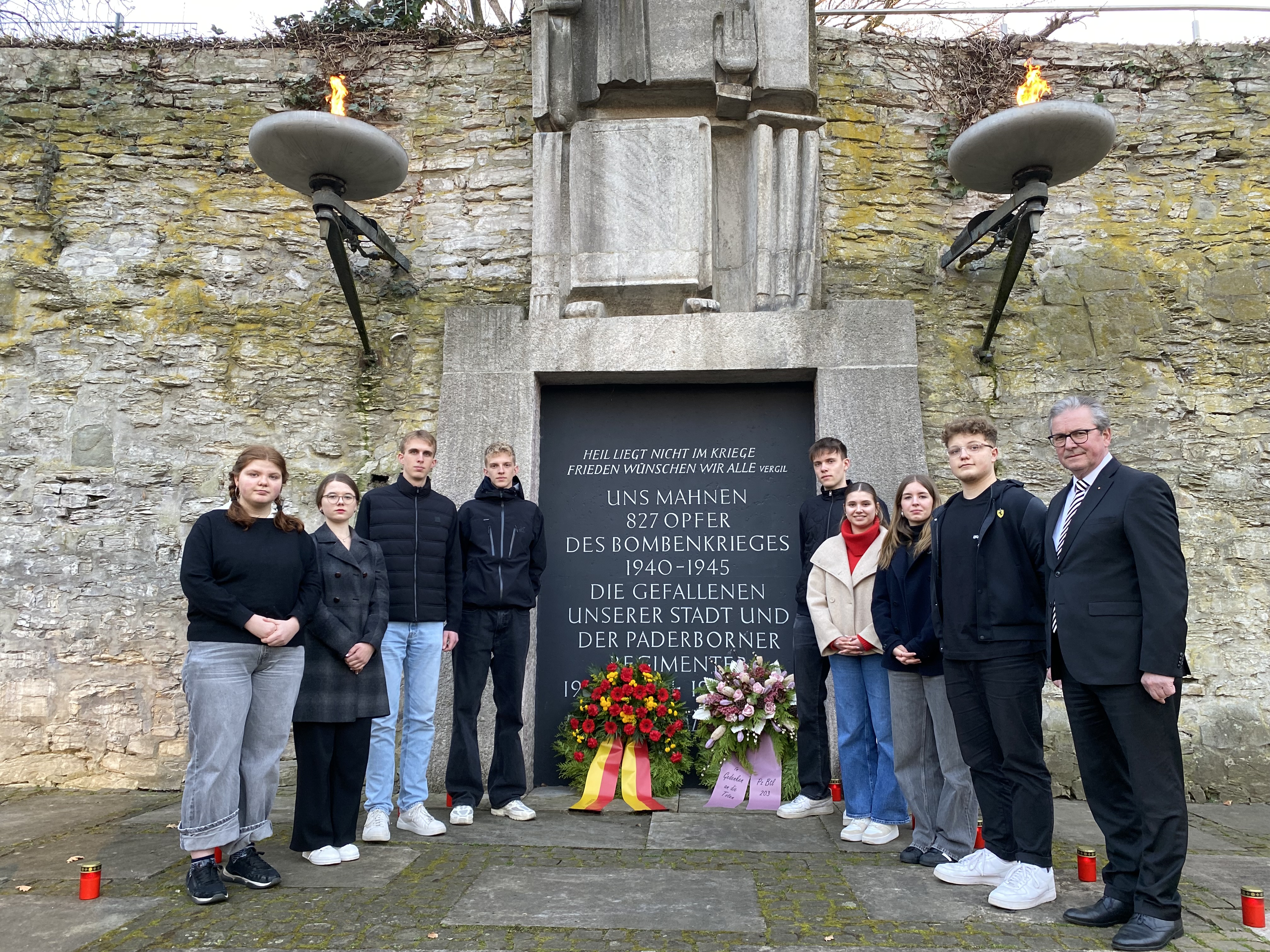Die Gestaltung der Gedenkfeier übernahmen in diesem Jahr Schülerinnen und Schüler des Gymnasiums Theodorianum, die sich gemeinsam mit ihren Lehrern Marvin Wehrmann und Jörg Heger im Deutsch- sowie Geschichtsleistungskurs mit der Bombardierung Paderborns auseinandergesetzt hatten. Mit inspirierenden Beiträgen wie einem Gedicht, Zitaten von Zeitzeugen oder auch einem Gespräch darüber, auf welche Art man sich heutzutage mit der Kriegsvergangenheit auseinandersetzen kann, leisteten sie einen Beitrag gegen das Vergessen und riefen ins Bewusstsein, dass Frieden nicht selbstverständlich ist.
