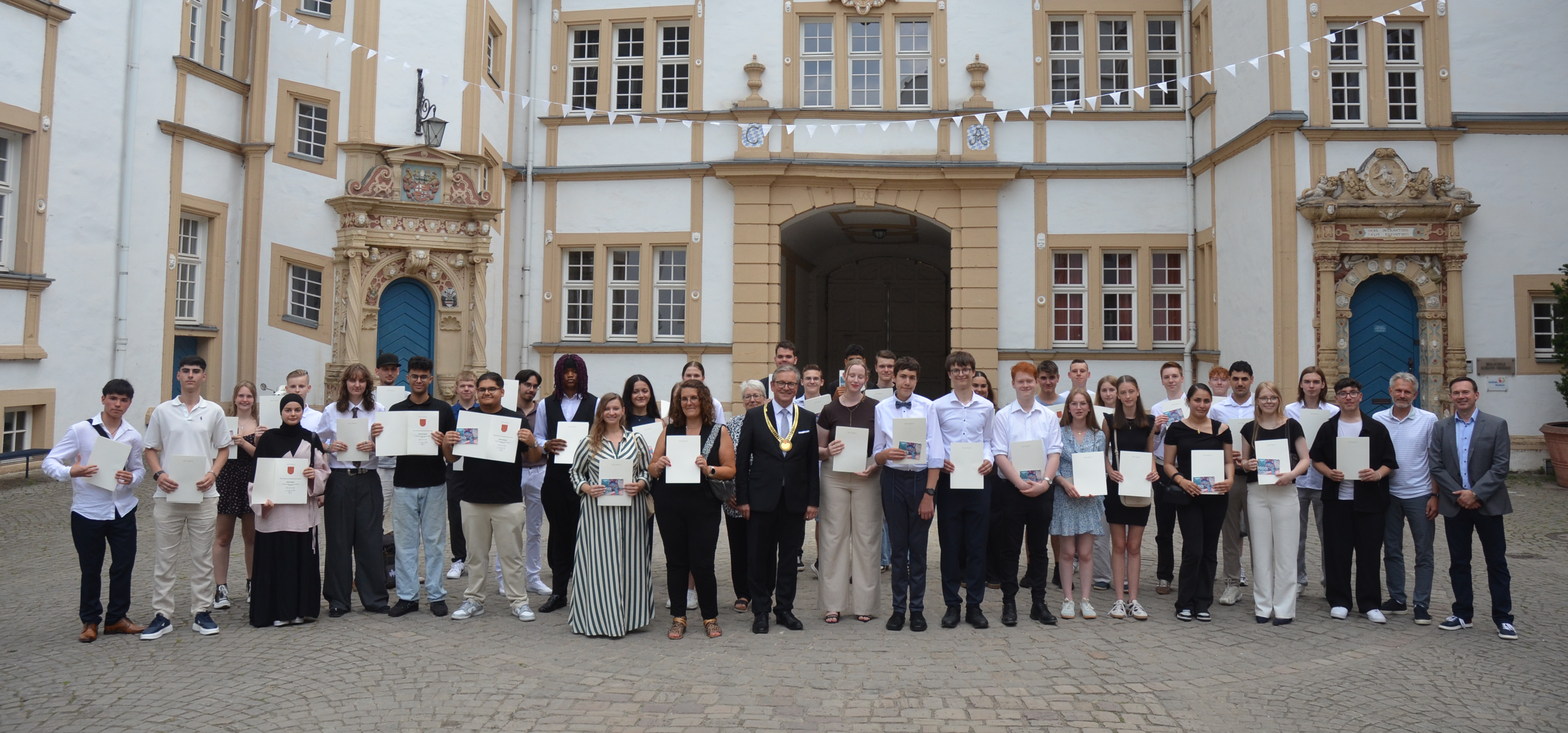 Montag, 07. Juli 2025 | Stadt Paderborn - Auch in diesem Jahr wurden zahlreiche Schüler*innen der Sekundarstufe I für ihre herausragenden Leistungen von der Stadt Paderborn geehrt. Im feierlichen Rahmen empfing Bürgermeister Michael Dreier die Absolvent*innen am Mittwochabend im Audienzsaal des Schlosses in Schloß Neuhaus. „Ihr habt einen bedeutenden Meilenstein erreicht - einen sehr guten Schulabschluss, der euch als wichtiges solides Fundament für die nächsten Schritte dienen wird“, betonte Bürgermeister Dreier in seiner Ansprache. Gemeinsam mit den Jugendlichen waren auch ihre Schulleitungen, einige Vertreter*innen der Elternpflegschaften sowie Mitglieder des Schulausschusses zu der Veranstaltung zusammengekommen.