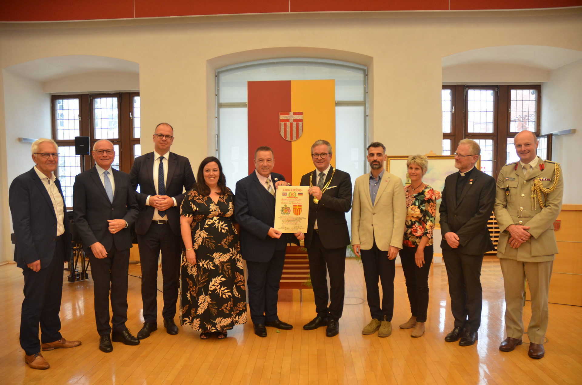 Zahlreiche Ehrengäste folgten der Einladung ins Rathaus: Andrew Morgan, der stellvertretende Bürgermeister von Bolton, kam mit seiner Partnerin, ebenso die britische Honorarkonsulin Susan Speller, der Ehrenringträger Josef Hackfort, der britische Militärattaché und Verbindungsoffizier an der britischen Botschaft in Berlin Colonel Benjamin Davenport. Ebenfalls mit anwesend waren Vertreterinnen und Vertreter des Deutsch-Englischen Clubs mit ihrer Vorsitzenden Prof. Dr. Ilka Mindt, sowie Vertreter*innen aus Bolton und Gäste aus weiteren Partnerstädten.