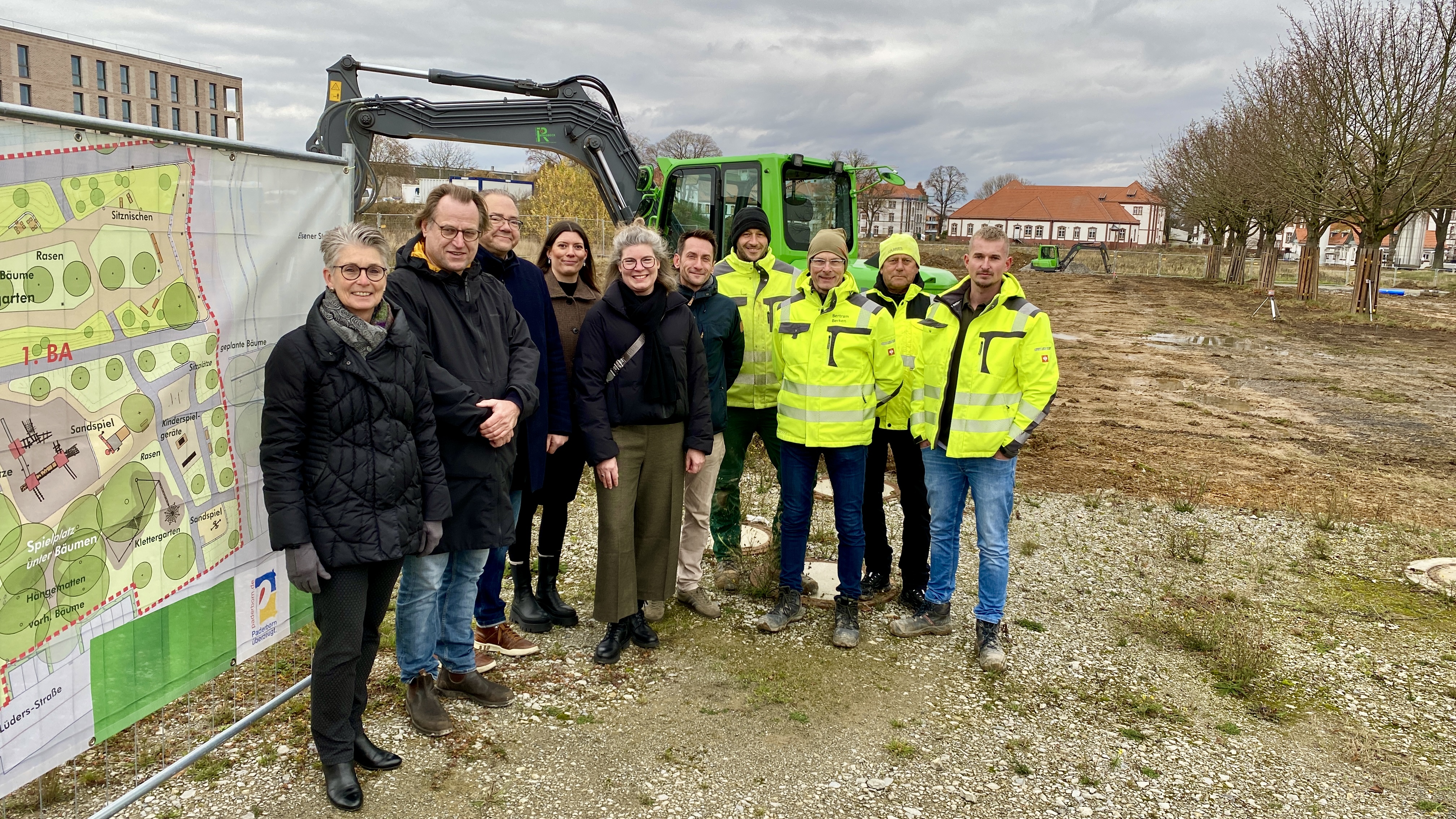 Donnerstag, 20. November 2025 | Stadt Paderborn - Mit dem Alanbrooke Quartier entsteht mitten in Paderborn ein großes neues Stadtviertel. In der dort bereits realisierten Kita ist vor rund einem Jahr Leben eingezogen, die ersten Käufer*innen erhielten im Oktober die Schlüssel für ihre Eigentumswohnungen. Nun startet auch die Herrichtung der großzügigen Freianlagen: Auf einem Plangebiet von insgesamt 5,2 Hektar, das sich vom ehemaligen Exerzierfeld im Norden bis zum Quartiersplatz im Süden erstreckt, wird bis voraussichtlich Herbst 2028 eine große Grünanlage mit multifunktionalen Nutzungsmöglichkeiten entstehen. Für den ersten und zweiten Bauabschnitt, die ab sofort bis zum Frühsommer kommenden Jahres in Angriff genommen werden, bedeutet dies die Realisierung eines Spielplatzes, einer Parkouranlage und eines sogenannten Bürgergartens.