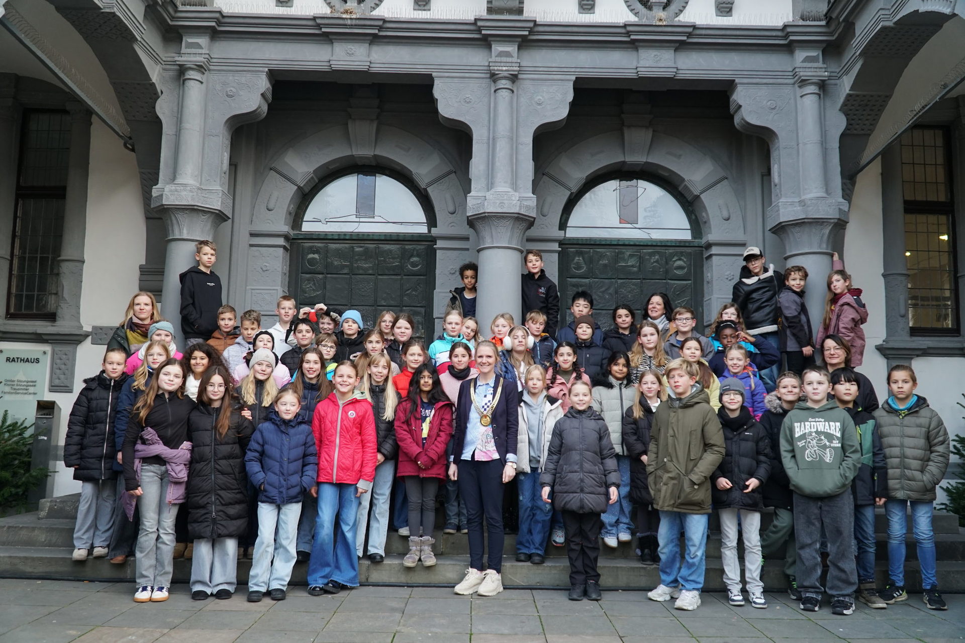 Donnerstag, 11. Dezember 2025 | Stadt Paderborn - Was genau hat Kommunalpolitik mit Schule zu tun? Mit dieser Frage hatten sich die fünften Klassen des Pelizaeus-Gymnasiums im Politikunterricht auseinandergesetzt. Um die Stadt näher kennenzulernen, einen Einblick in Kommunalpolitik zu bekommen und Fragen zu stellen, wurde der Jahrgang in das historische Rathaus Paderborn eingeladen. Dort wurden sie im großen Saal von der stellvertretenden Bürgermeisterin Stefanie Harth in Empfang genommen.