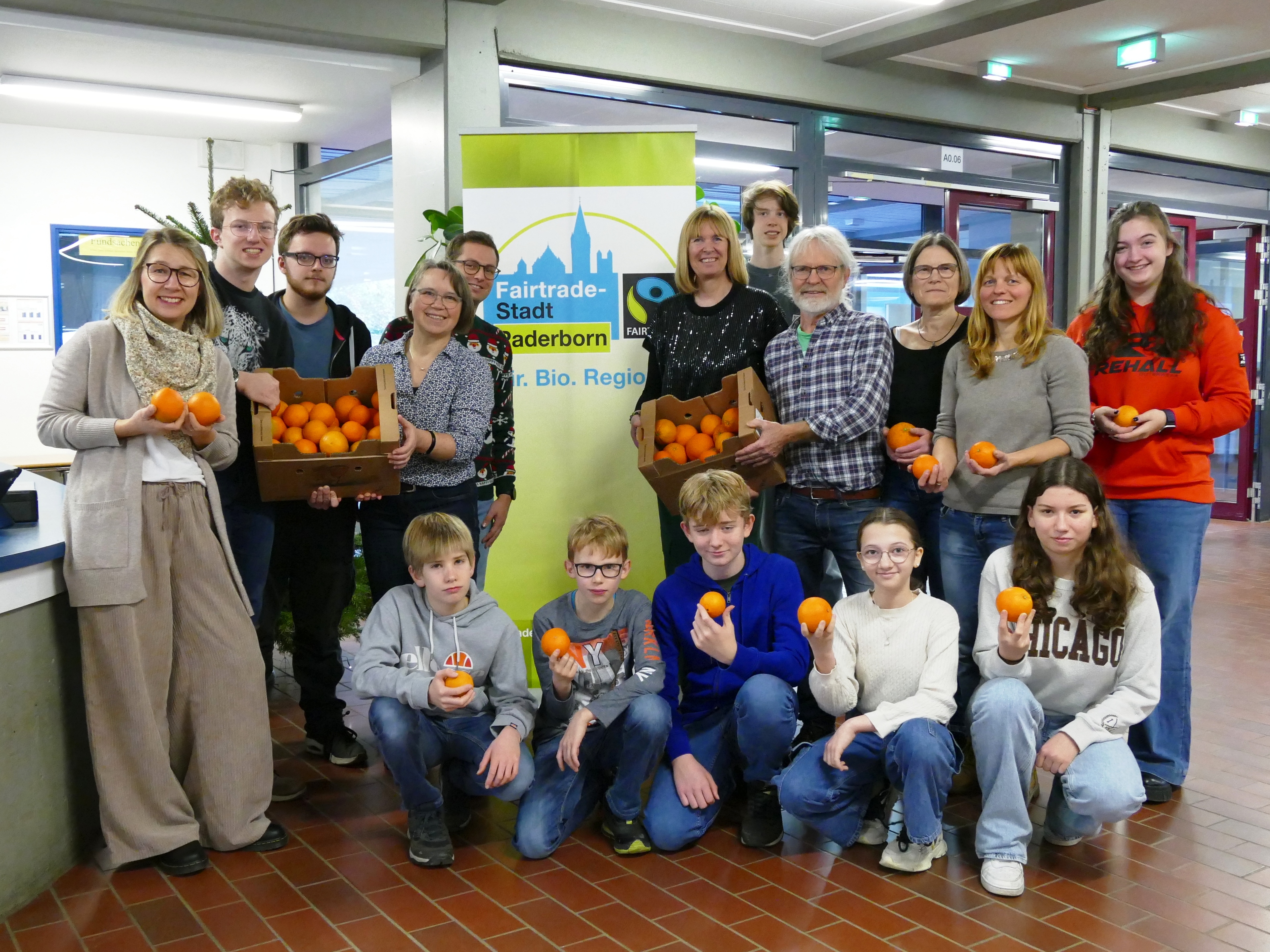 Mittwoch, 17. Dezember 2025 | Stadt Paderborn - Als Zeichen der Anerkennung für ihr Engagement im Fairen Handel überreichten Mitglieder der Steuerungsgruppe „Fairtrade Stadt Paderborn“ kürzlich zwei Kisten fair gehandelte Orangen an die Schüler*innengenossenschaft „Fairer Handel Goerdeler“. Die Übergabe erfolgte während des wöchentlichen Fairtrade-Verkaufs am Goerdeler-Gymnasium – der ersten zertifizierten Fairtrade-School Paderborns.