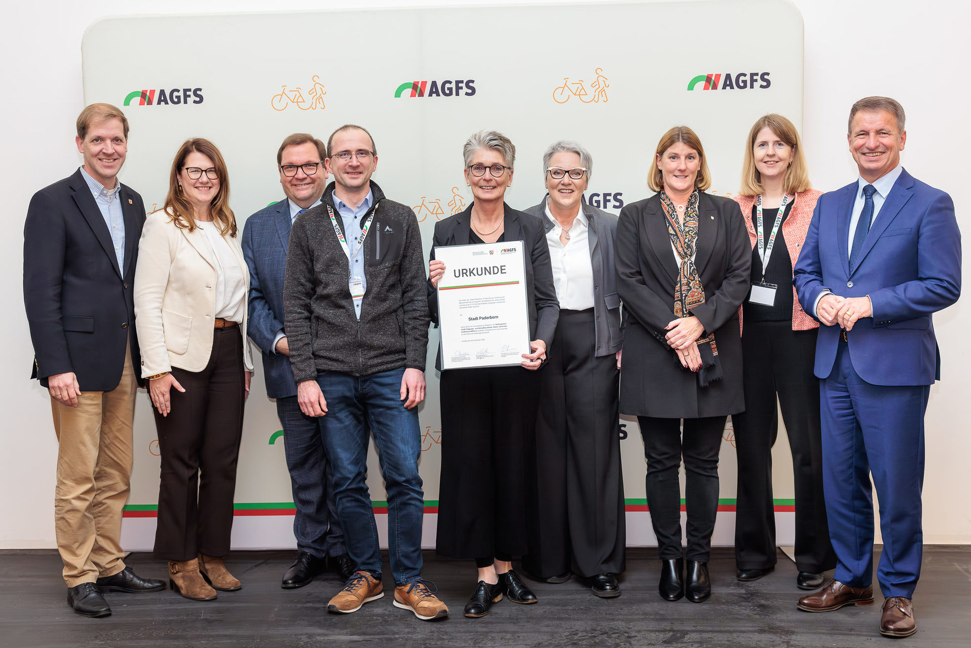 Donnerstag, 08. Januar 2026 | Stadt Paderborn - Die Stadt Paderborn ist als Mitglied der Arbeitsgemeinschaft fußgänger- und fahrradfreundlicher Städte, Gemeinden und Kreise in Nordrhein-Westfalen e.V. (AGFS NRW) rezertifiziert worden. Die Verlängerung der Mitgliedschaft bestätigt das kontinuierliche Engagement der Stadt für eine sichere und attraktive Fuß- und Radverkehrsmobilität. Die Verlängerungsurkunde wurde am 4. Dezember 2025 anlässlich der Mitgliederversammlung der AGFS NRW in Krefeld an die Technische Beigeordnete Claudia Warnecke und den Abteilungsleiter der konzeptionellen Verkehrsplanung, Harald Bock, überreicht. Paderborn ist seit 2018 Mitglied der AGFS; eine Rezertifizierung erfolgt nach erfolgreicher Bewerbung im Sieben-Jahres-Rhythmus.