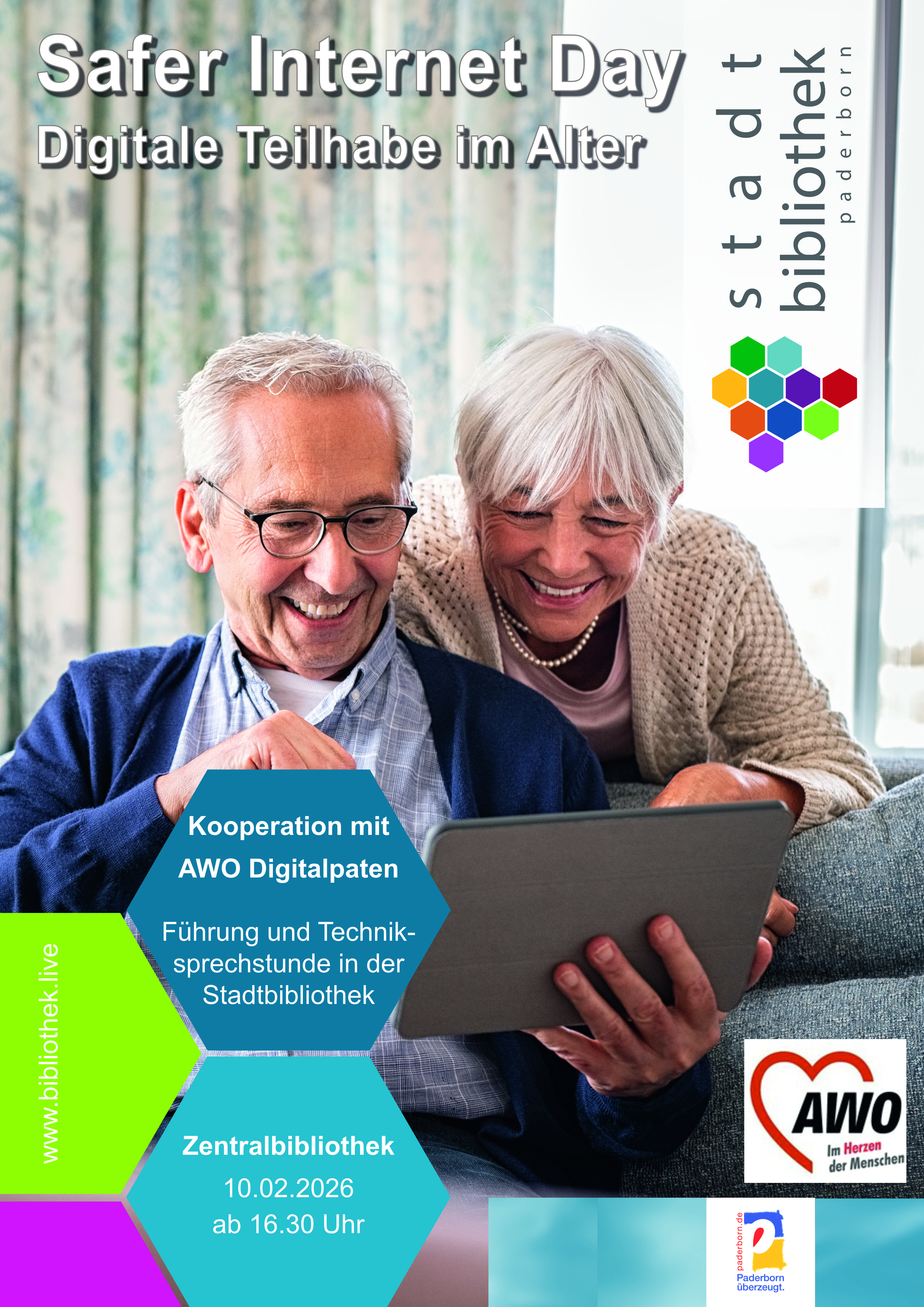 Dienstag, 03. Februar 2026 | Stadt Paderborn - Anlässlich des Safer Internet Day 2026 veranstaltet die Stadtbibliothek am Dienstag, 10. Februar, ab 16.30 Uhr eine Informationsveranstaltung für Senior*innen. Unter dem Titel „Digitale Teilhabe im Alter“ stehen sichere Internetnutzung, digitale Teilhabe und praktische Unterstützung im Mittelpunkt.