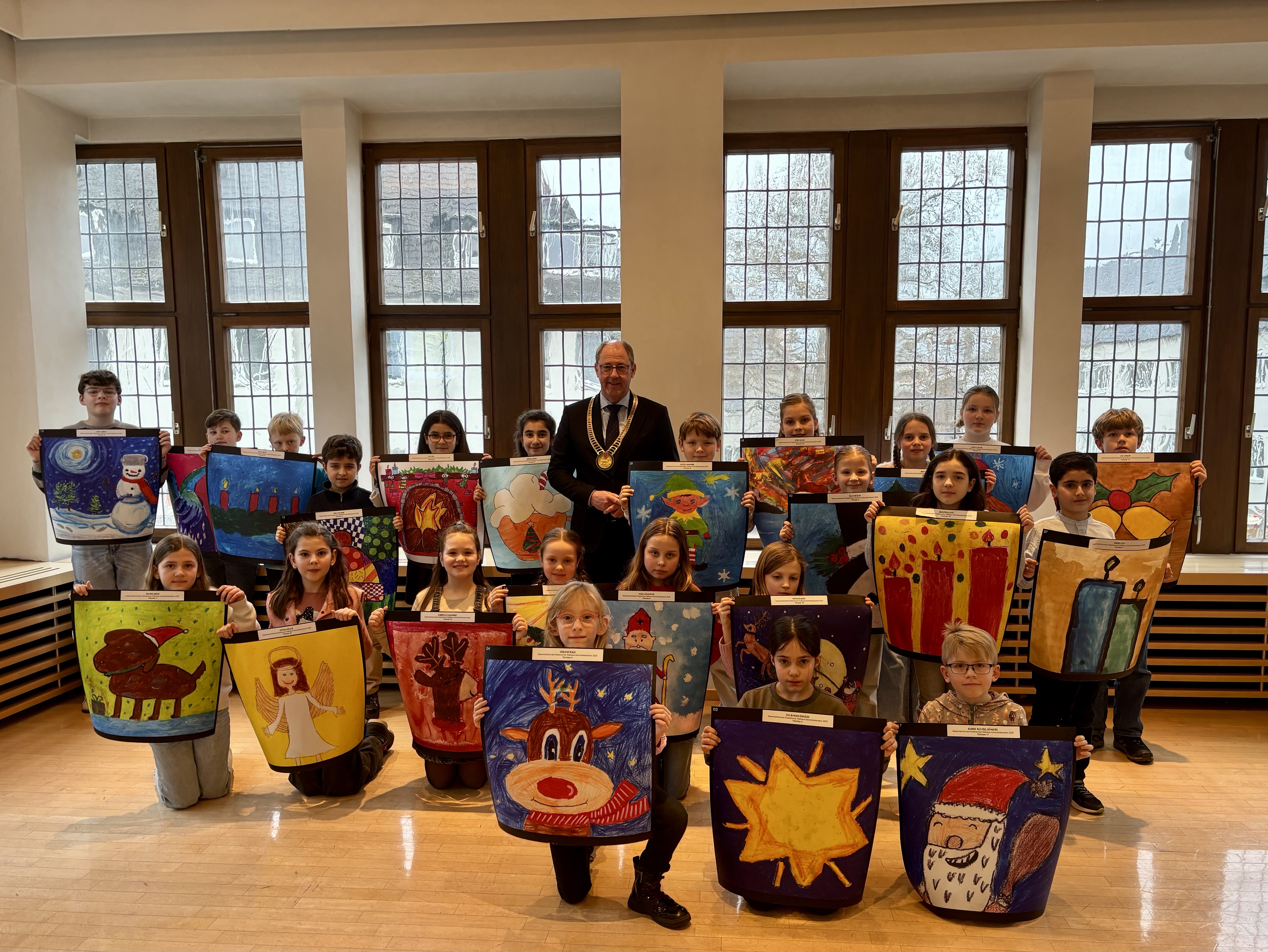 Mittwoch, 11. Februar 2026 | Stadt Paderborn - Im Paderborner Rathaus war am vergangenen Dienstag, 10. Februar, eine besondere Gruppe zu Gast. Die stolzen Gewinner*innen des Rathaus-Adventskalenders durften auf Einladung der Stadt Paderborn aufgrund ihrer tollen Leistungen das historische Rathaus besuchen. 24 Kinder, die im vergangenen Dezember beim Malwettbewerb zum Adventskalender am Paderborner Rathaus gewonnen hatten, wurden nun feierlich geehrt.