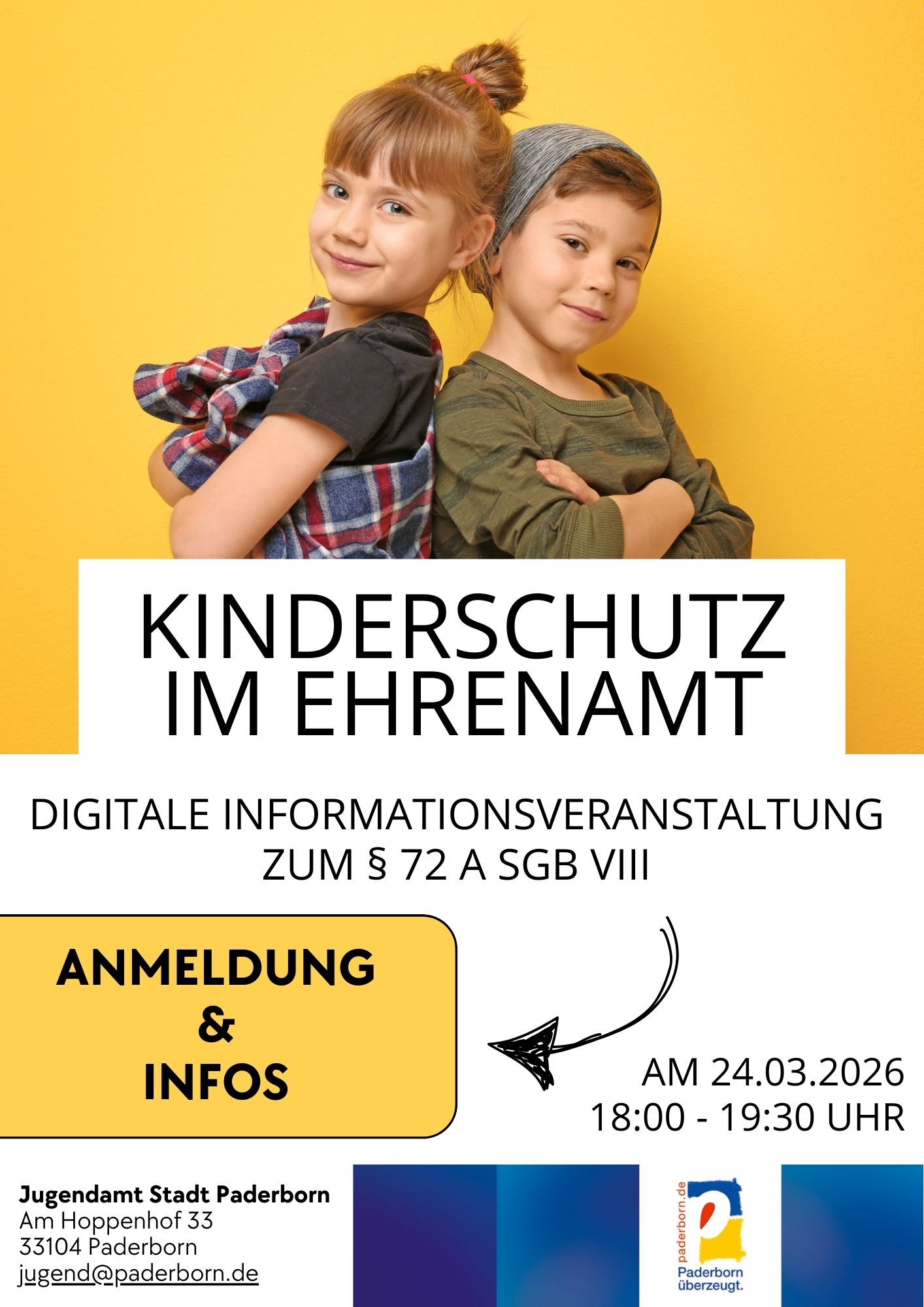 Dienstag, 24. Februar 2026 | Stadt Paderborn - Ehrenamtliche spielen in der Gesellschaft eine unverzichtbare Rolle. Gerade in der Vereinsarbeit tragen sie große Verantwortung, denn sie fördern Kinder und Jugendliche in ihrer Persönlichkeitsentwicklung, ihrem Selbstbewusstsein und ihren sozialen Kompetenzen. Das Jugendamt der Stadt Paderborn lädt nun zur digitalen Informationsveranstaltung über den präventiven Kinderschutz im Ehrenamt und der damit verbundenen Einsichtnahme in erweiterte Führungszeugnisse ein.