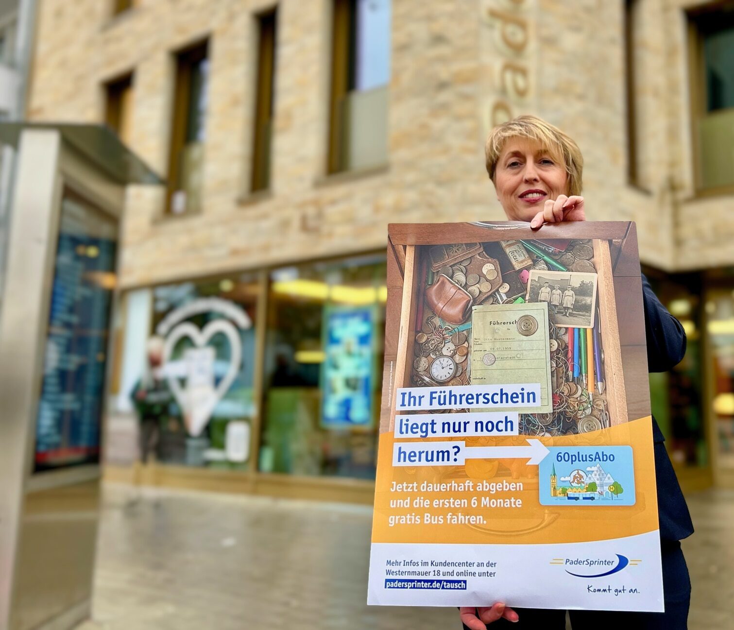 Mittwoch, 04. März 2026 | Stadt Paderborn - Seit Anfang des Jahres können Paderbornerinnen und Paderborner ab 60 Jahren ihren Führerschein gegen ein kostenloses 60plusAbo des PaderSprinter eintauschen. Zu dieser Aktion informiert der PaderSprinter am Montag, 09.03.2026 vor Ort im Südring Center. Der Infostand ist von 10.00 Uhr bis 13.00 Uhr gegenüber der Center-Information in der Nähe des Aufzugs zu finden. Hier bekommt man auch Flyer mit den wichtigen Informationen zur Aktion – zum Selbernutzen, Weitersagen und Überzeugen für Verwandte, Freunde und Freundinnen.