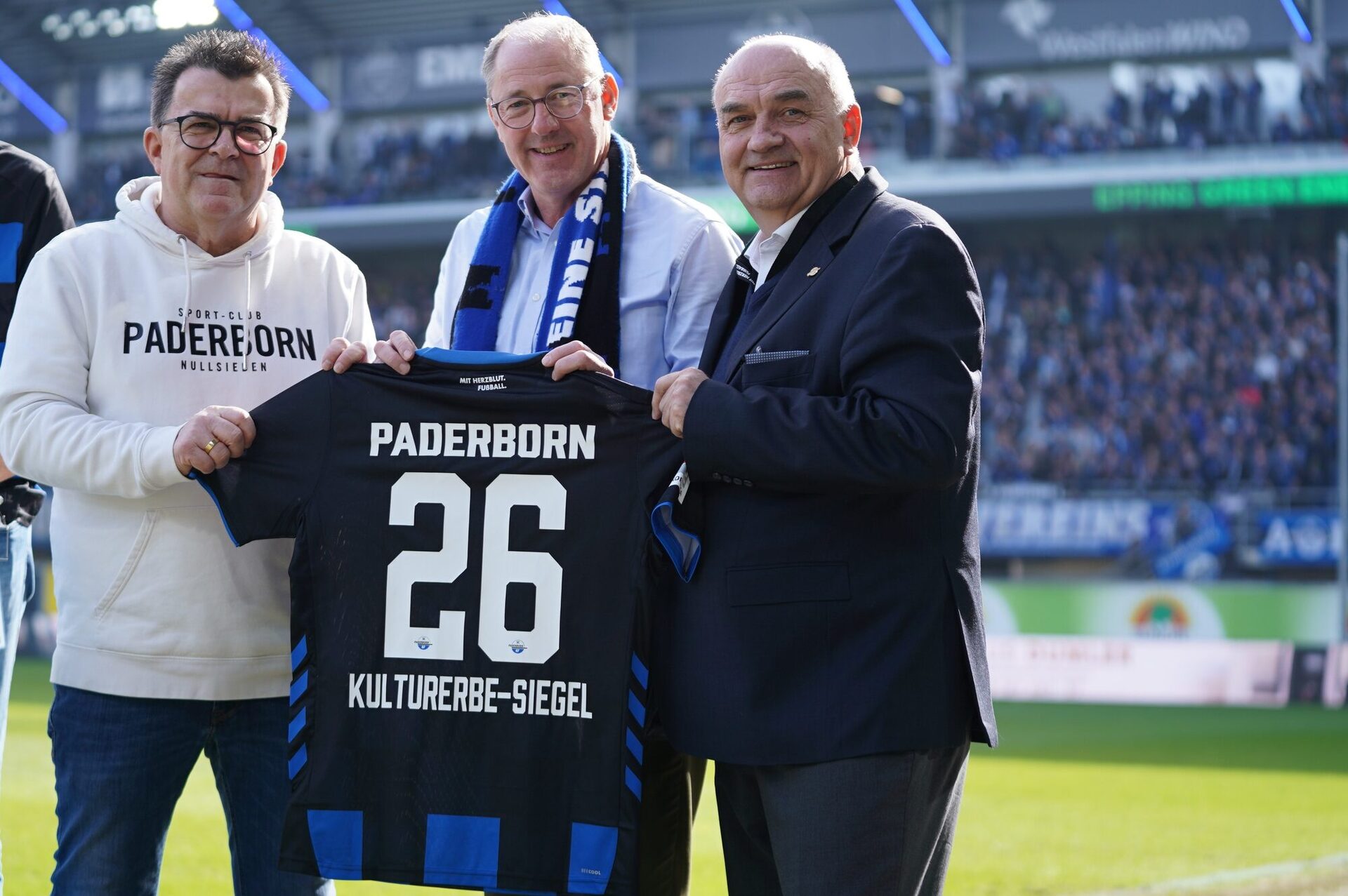 Montag, 09. März 2026 | Stadt Paderborn - Paderborn - Kulturerbe-Siegel. Das ist die Aufschrift des Trikots des SC Paderborn 07, das der Verein jetzt Bürgermeister Stefan-Oliver Strate beim jüngsten Heimspiel übergab. SCP-Präsident Thomas Sagel und SCP-Geschäftsführer Martin Hornberger würdigten damit die Auszeichnung, die die Stadt Paderborn jüngst erhielt. Für die einzigartige urbane Flusslandschaft Pader wurde Paderborn mit dem Europäischen Kulturerbe-Siegel 2025 ausgezeichnet. Unter dem Titel „Stadt.Mensch.Fluss. – Die Pader für Europa“ hatte sich Paderborn 2023 offiziell beworben. "Dass der SC Paderborn seine Verbundenheit mit der Stadt Paderborn auf diese Weise einmal mehr zeigt, freut mich sehr", so der Bürgermeister, der für diese Trikotübergabe die Podiumsdiskussion zum Internationalen Frauentag im Paderborner Rathaus eher verlassen musste.