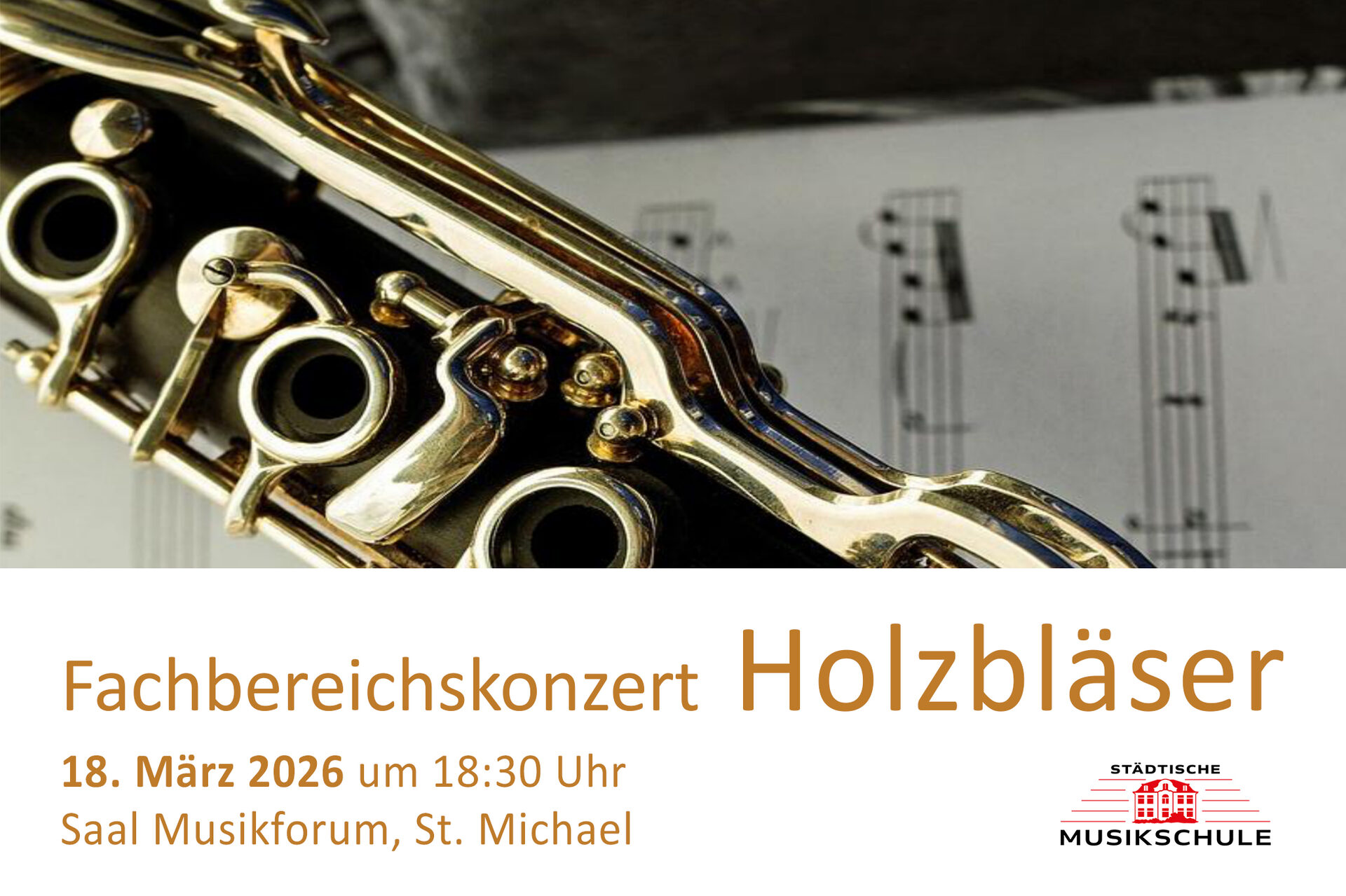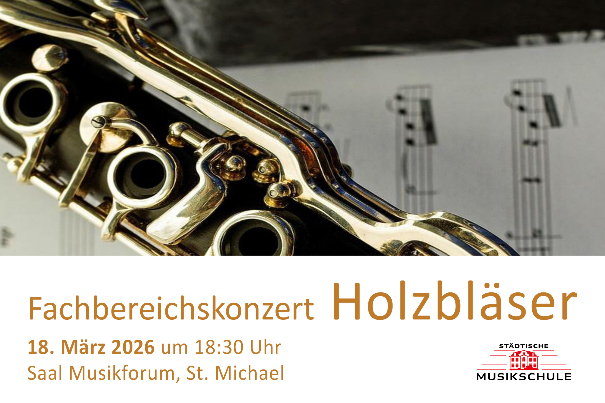Montag, 16. März 2026 | Stadt Paderborn - Die Abteilung „Holzblasinstrumente“ der Städtischen Musikschule lädt am Mittwoch, 18. März, um 18.30 Uhr zum Fachbereichskonzert in den Saal des Musikforums St. Michael ein. Die Schüler*innen bieten mit Querflöte, Oboe, Klarinette, Blockflöte, Saxophon und Fagott ein vielfältiges Programm aus vier Jahrhunderten.