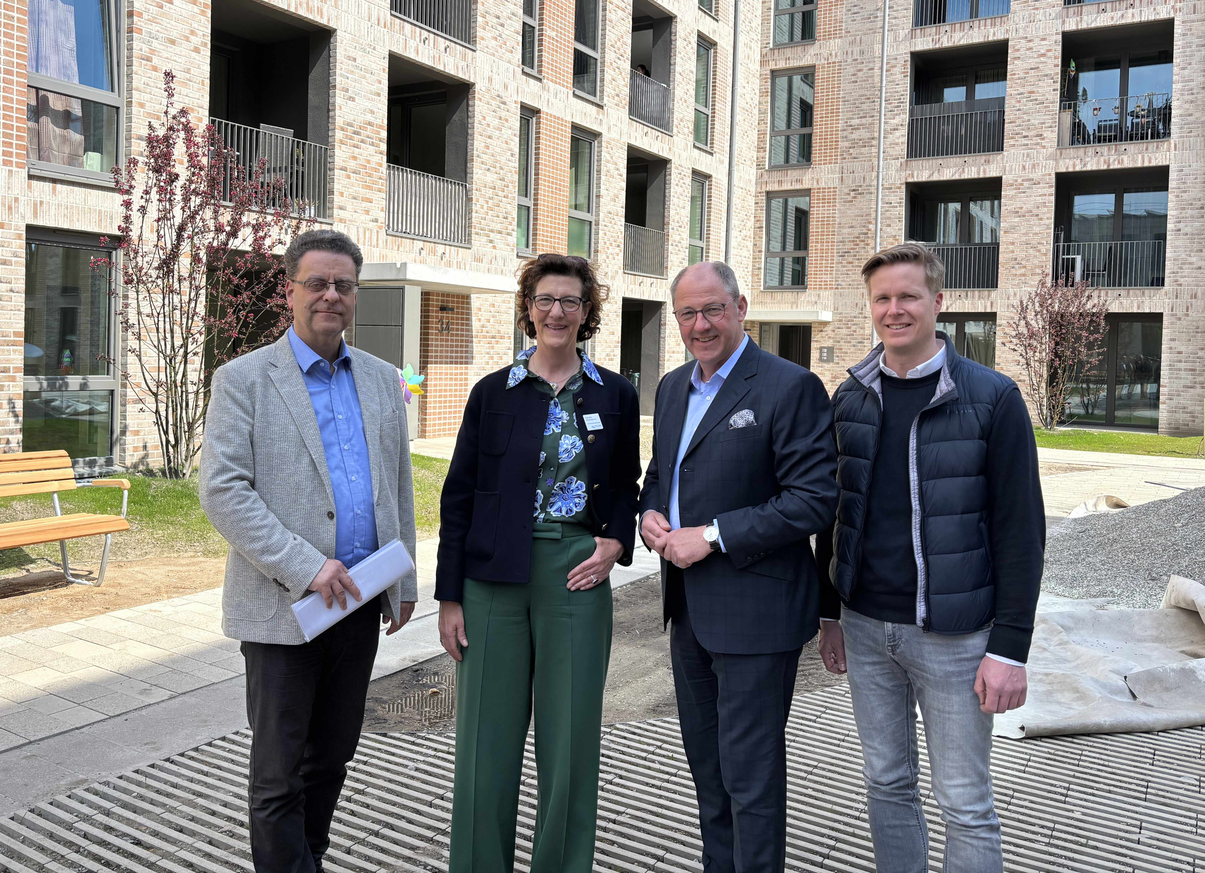 Samstag, 18. April 2026 | Stadt Paderborn - Noch bis Mai hat die Wohnungsgesellschaft Paderborn (WGP) Zeit, dann müssen die 317 Wohnungen, die die Gesellschaft am südlichen Ende des Alanbrooke Quartiers baut, bezugsfertig sein. Mit Hochdruck wird daher gerade an der Fertigstellung der letzten Wohnungen sowie der Freiflächen zwischen den Gebäuden gearbeitet und 120 Wohnungen sind inzwischen auch schon bezogen. Davon überzeugten sich bei einem Besuch vor Ort jetzt auch Claudia Hillenherms, Mitglied des Vorstands bei der NRW.BANK und Bürgermeister Stefan-Oliver Strate.