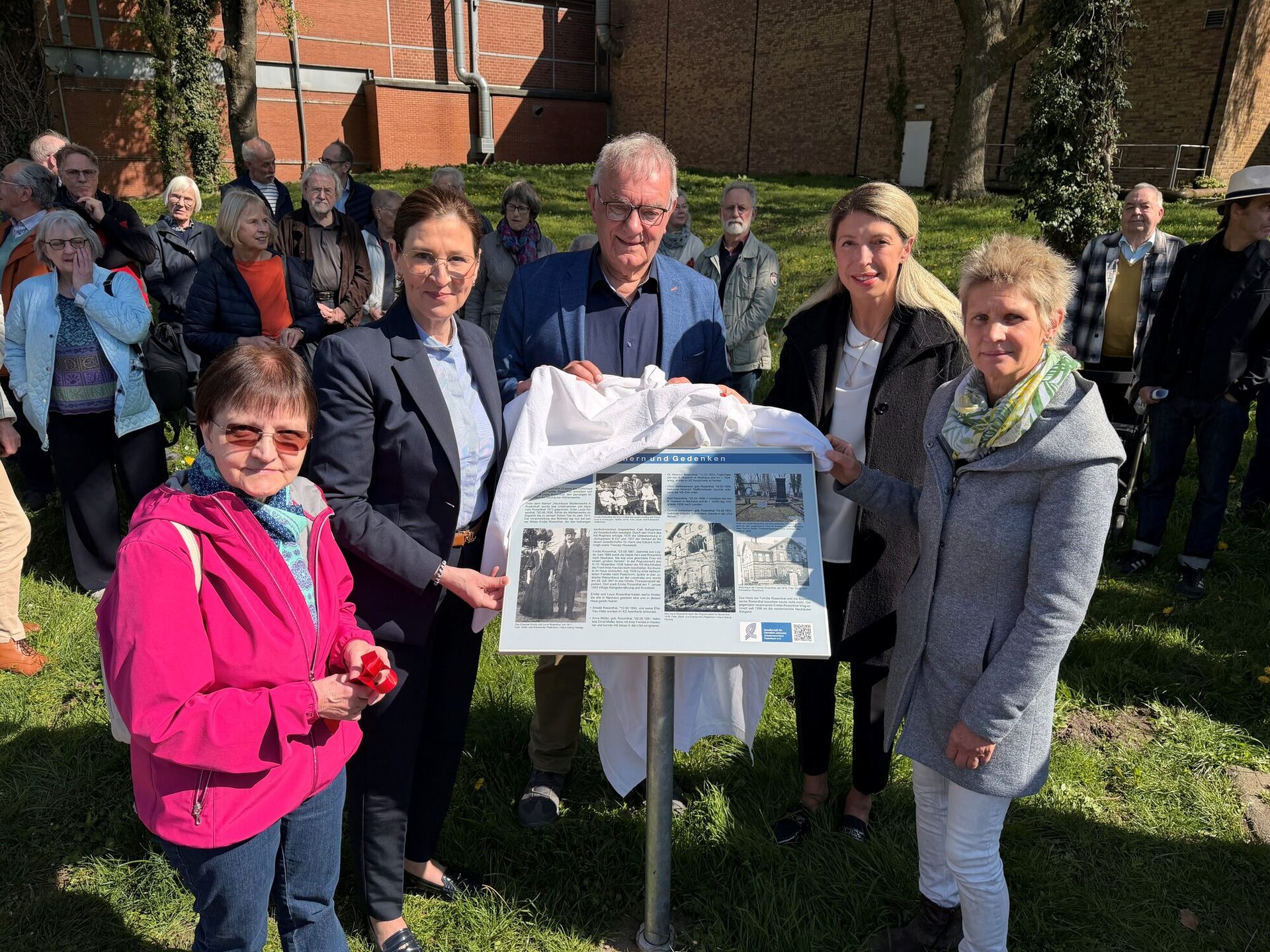Montag, 20. April 2026 | Stadt Paderborn - Am Freitagvormittag wurde an der Bushaltestelle „Emilie-Rosenthal-Weg“ in Schloß Neuhaus eine Erinnerungstafel für Familie Rosenthal eingeweiht – an dem Ort, wo das Wohnhaus der Familie einst stand. „Familie Rosenthal hat sich in besonderer Weise in unserer Stadtgesellschaft engagiert, wurde danach aber auf unvorstellbare Weise ausgegrenzt“, erklärte die stellvertretende Bürgermeisterin Sabine Kramm während ihrer Ansprache zur Enthüllung der Tafel. „Wir müssen uns gemeinsam dafür einsetzen, dass Geschichte in Erinnerung bleibt“, mahnte sie.