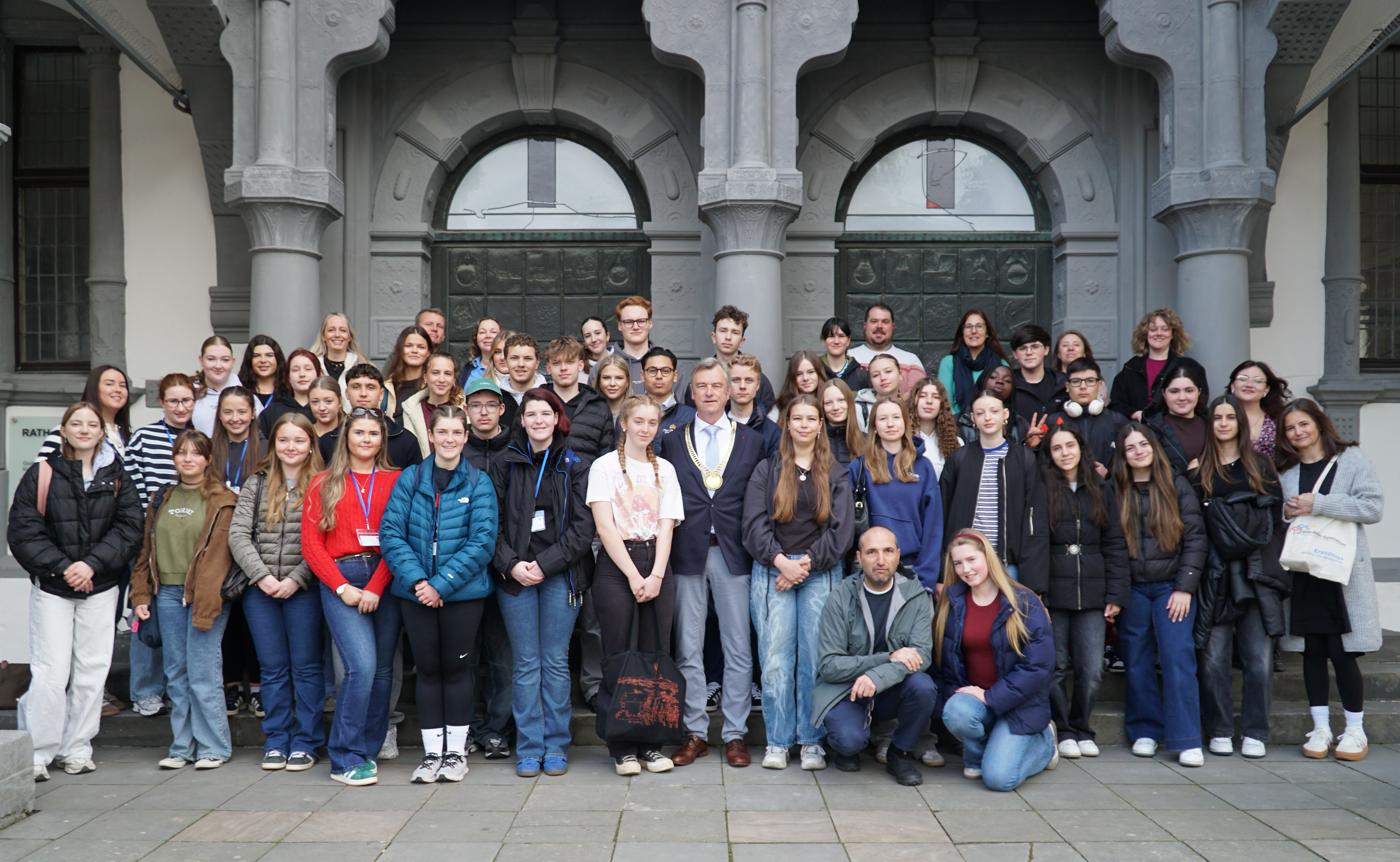 Montag, 20. April 2026 | Stadt Paderborn - „Herzlich willkommen hier in Paderborn. Ich freue mich sehr, dass ihr heute unsere Gäste seid“, empfing der stellvertretende Bürgermeister Robert Siemensmeyer am Donnerstagvormittag rund 70 Schüler*innen mit ihren Lehrkräften im großen Saal des historischen Rathauses. Die Jugendlichen kommen aus Spanien, Portugal, Irland sowie aus Schweden und setzen sich, gemeinsam mit ihren Austauschpartner*innen des Goerdeler Gymnasiums, aus zwei Projektgruppen zusammen: Ein Teil gehört einer Erasmus+-Gruppe des Projekts „Fake or Real – How AI is changing the game“ mit Teilnehmer*innen aus Spanien, Portugal, Schweden und Deutschland an. Die zweite Gruppe ist Teil des Projekts „Strong Women – Strong Voices“ mit Schüler*innen aus Irland und Deutschland.