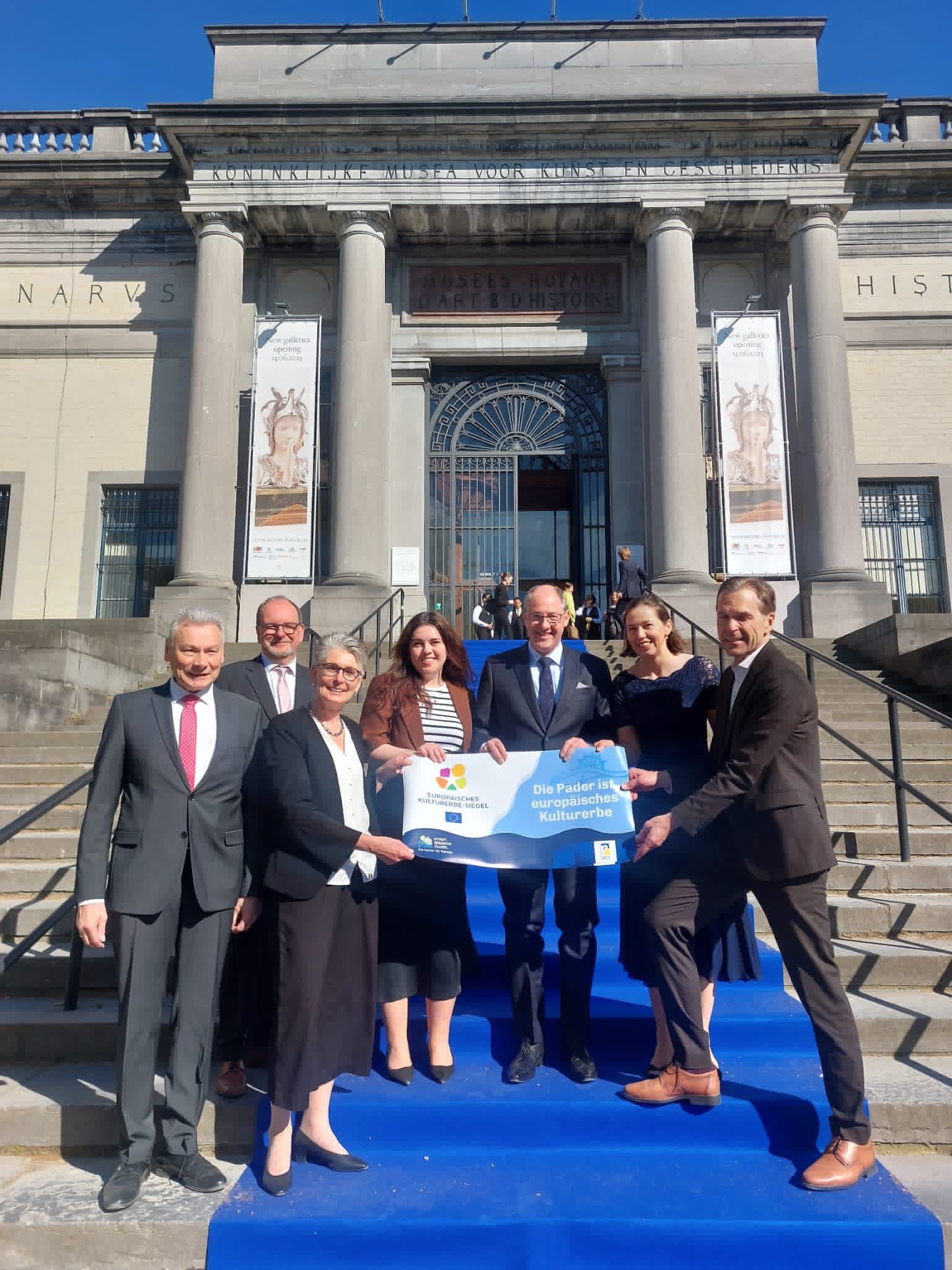 Donnerstag, 23. April 2026 | Stadt Paderborn - Am Mittwochabend durfte eine Delegation aus Paderborn im „Art and History Museum“ in Brüssel das Europäische Kulturerbe-Siegel (EHL) während eines offiziellen Festakts entgegennehmen. Bereits im Februar stand fest, dass die einzigartige urbane Flusslandschaft Pader neben zwölf weiteren europäischen Stätten mit dieser besonderen Würdigung ausgezeichnet wird. Bürgermeister Stefan-Oliver Strate, die Technische Beigeordnete Claudia Warnecke, Prof. Dr. Peter Fäßler von der Universität Paderborn, Dieter Honervogt als Vorsitzender des Vereins „Freunde der Pader e. V.“ sowie die Programmleiter des Projektes „Europäisches Kulturerbe-Siegel“, Brigitte Zacharias und Prof. Dr. Michael Ströhmer, nahmen das Siegel bei einer feierlichen Zeremonie in Empfang.