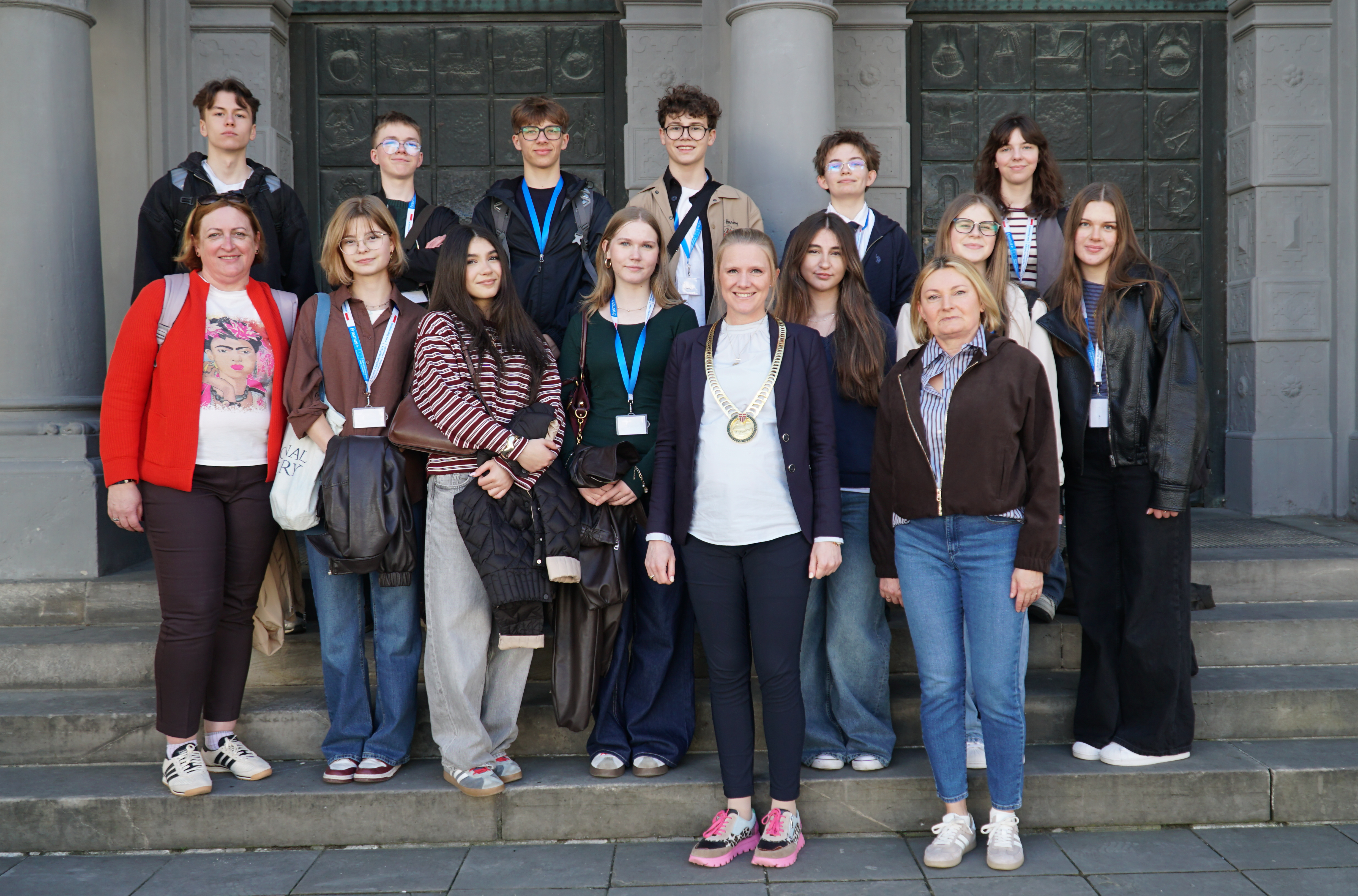 Freitag, 24. April 2026 | Stadt Paderborn - Am Donnerstagvormittag empfing die stellvertretende Bürgermeister Stefanie Harth eine zwölfköpfige Schülergruppe und ihre zwei Lehrkräfte aus Paderborns Partnerstadt Przemyśl. Die polnischen Mädchen und Jungen sind seit Mittwoch in der Paderstadt zu Gast und nehmen an einem Austausch mit Schüler*innen des Gymnasiums Schloß Neuhaus teil.