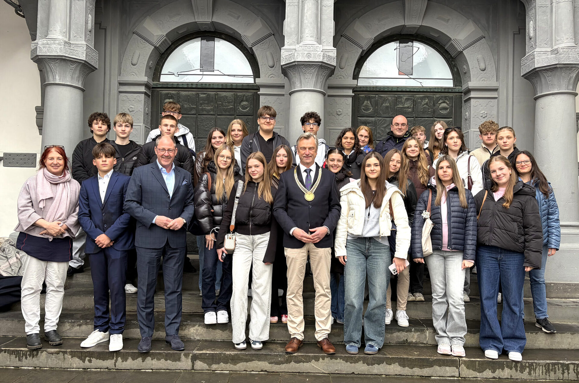 Montag, 27. April 2026 | Stadt Paderborn - Schüler*innen aus der Paderborner Partnerstadt Debrecen in Ungarn, genauer vom Csokonai Vitéz Mihály Gimnázium, hat der stellvertretende Bürgermeister Robert Siemensmeyer vor kurzem im Rathaus empfangen. Sie waren gemeinsam mit ihren Austauschpartner*innen vom Gymnasium Schloß Neuhaus zu Gast. Siemensmeyer hieß alle herzlich willkommen und stellte den Gästen die Stadt Paderborn in all ihren Facetten vor. So ging er unter anderem auf die Geschichte des Rathauses ein und betrachtete Paderborn als historische Stadt.