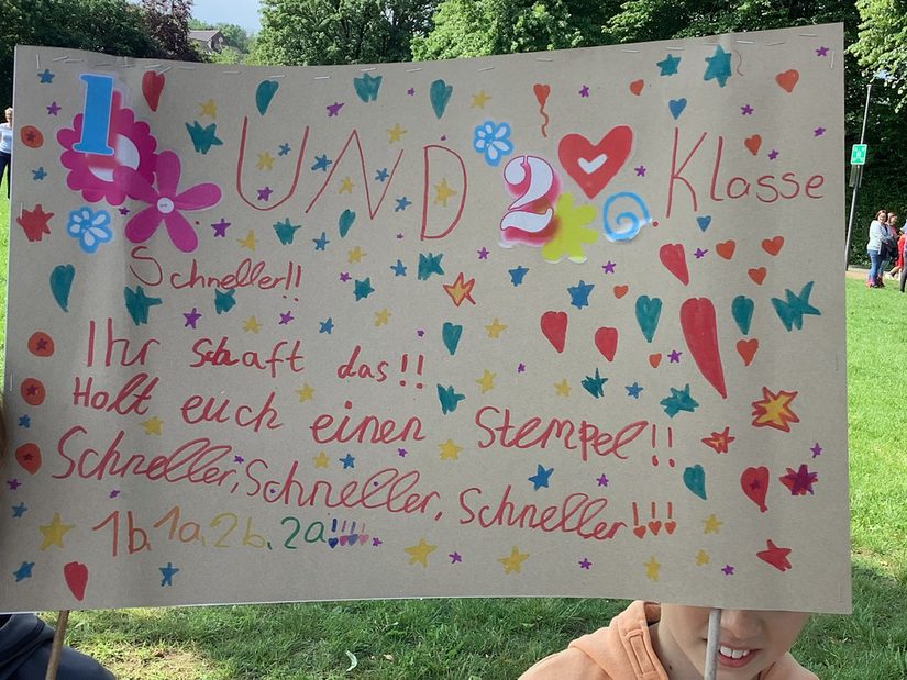 Der heutige Sponsorenlauf hat allen Beteiligten viel Spaß gemacht. Auch das Anfeuern hat große Freude bereitet und die Läuferinnen und Läufer angespornt. Im Vorfeld wurden Plakate gebastelt, Anfeuerungs-Rufe geübt und natürlich Sponsoren gesucht.