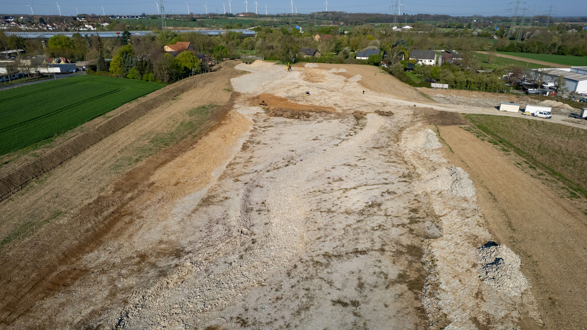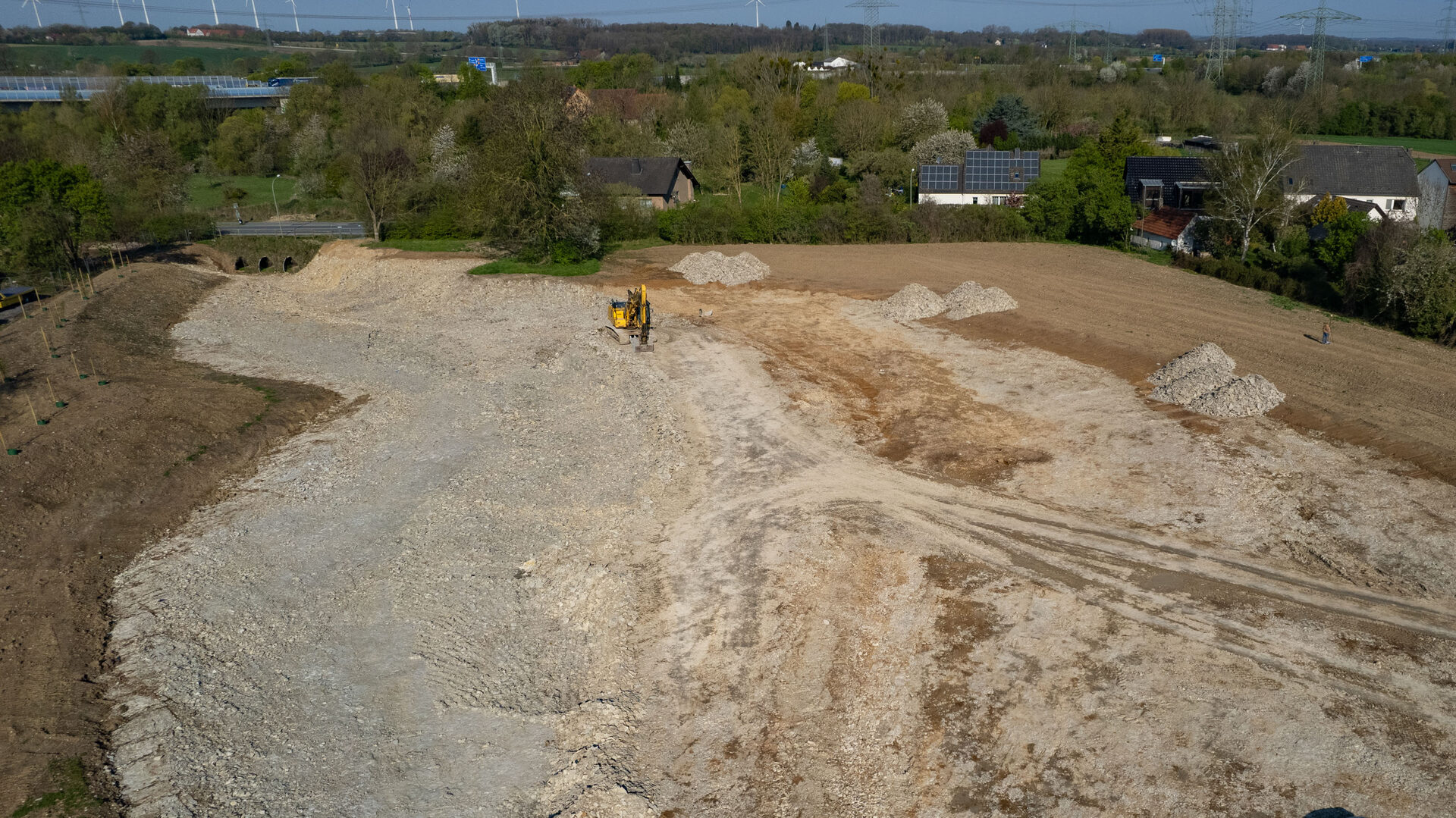 Februar 2026: Die Arbeiten zur Gestaltung des 2. BA schreiten voran. Die Oberboden-Umlagerung ist bereits weitgehend abgeschlossen. Es sind steinig-magere Standorte entstanden, die zukünftig angepassten Tier- und Pflanzenarten hochwertige Lebensräume bieten werden. Sie werden durch flache Geländeaufhöhungen, die in Kürze bepflanzt werden, abgeschirmt.