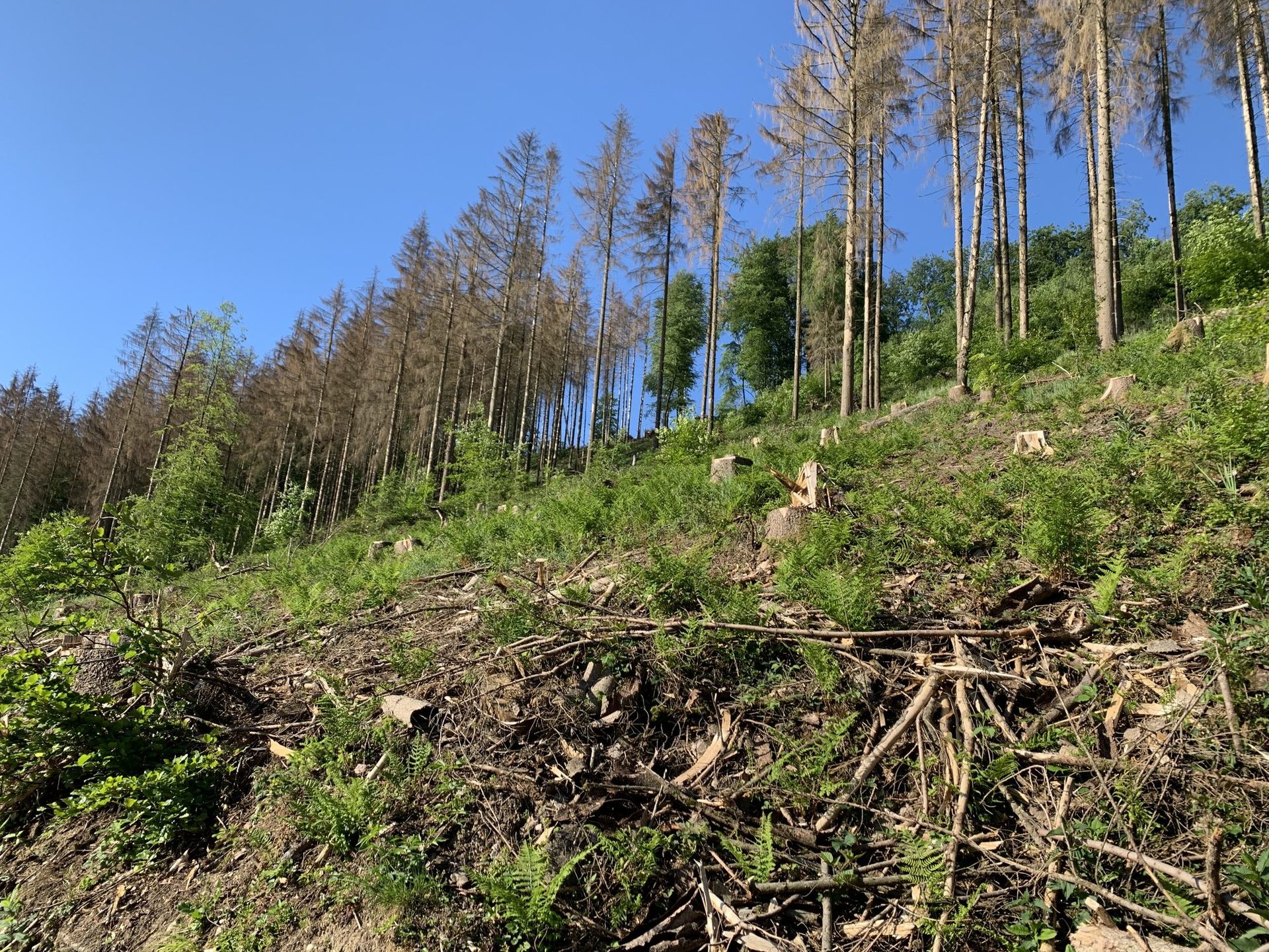 Der Wald verändert sich, das ist sichtbar. Überall an den Waldwegen sind große Holzpolter zu sehen, die vor einigen Jahren noch mit dichten Fichtenwäldern bestandenen Flächen sind kahl geschlagen. Dort wo die abgestorbenen Bäume noch stehen, knirschen die herabgerieselten Nadeln unter den Füßen. Sonnenstrahlen treffen auf den Waldboden der Buchen- und Eichenwälder - sie sind lichter geworden. Aber ist der Wald wirklich bedroht?