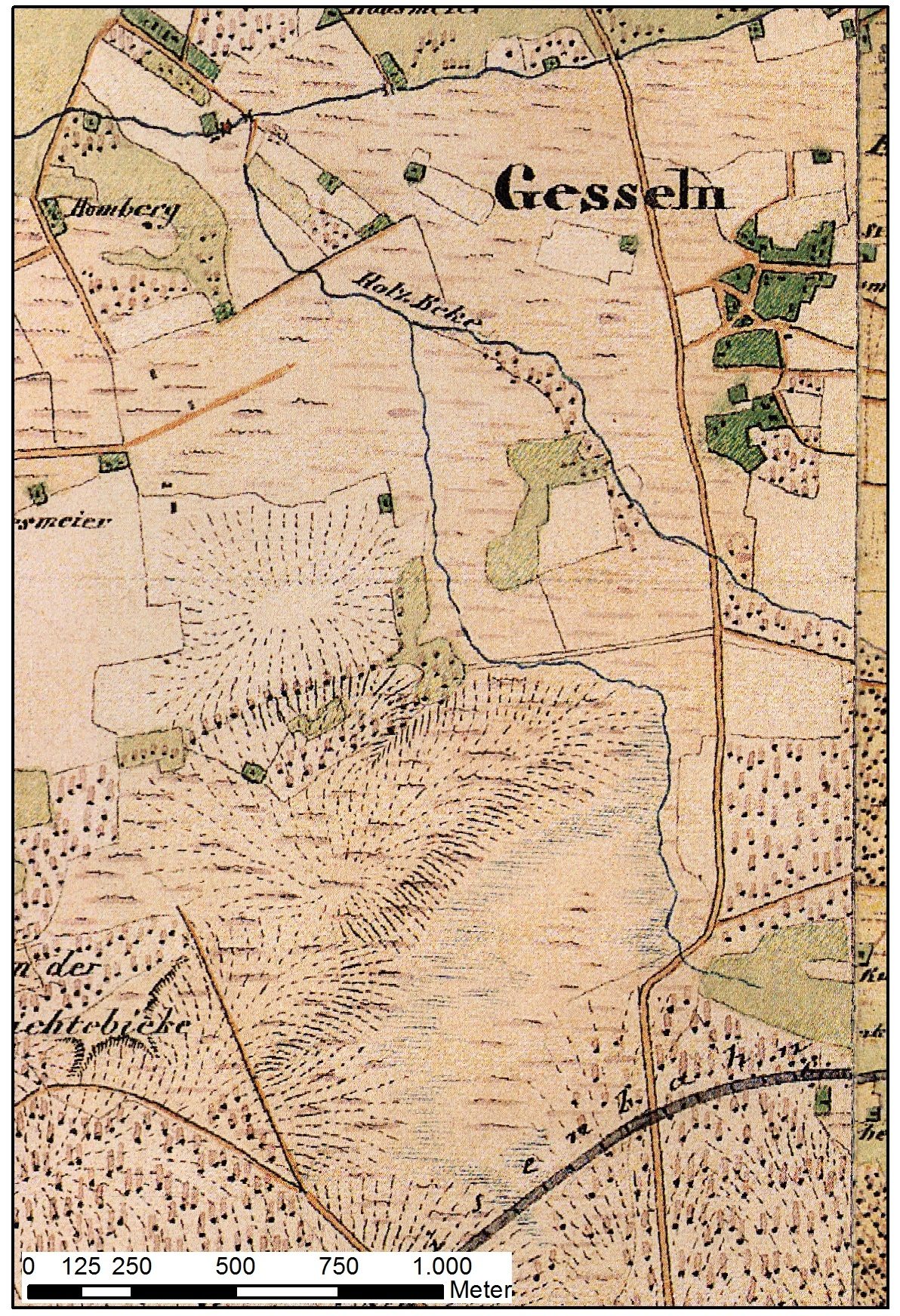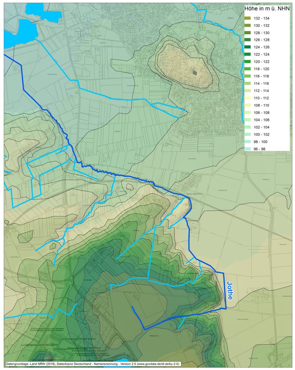 Etwa einen Kilometer verläuft die Jothe ab der Quelle in ihrem Tal nach Osten. Am Fuß der Hochfläche trifft sie auf weite Talung der unteren Alme und damit auf die Geseker Unterbörde. Auch andere am Rand der Kalkhochfläche entspringenden Gewässer verlaufen weiter nach Norden und bilden hier feuchte Niederungen.