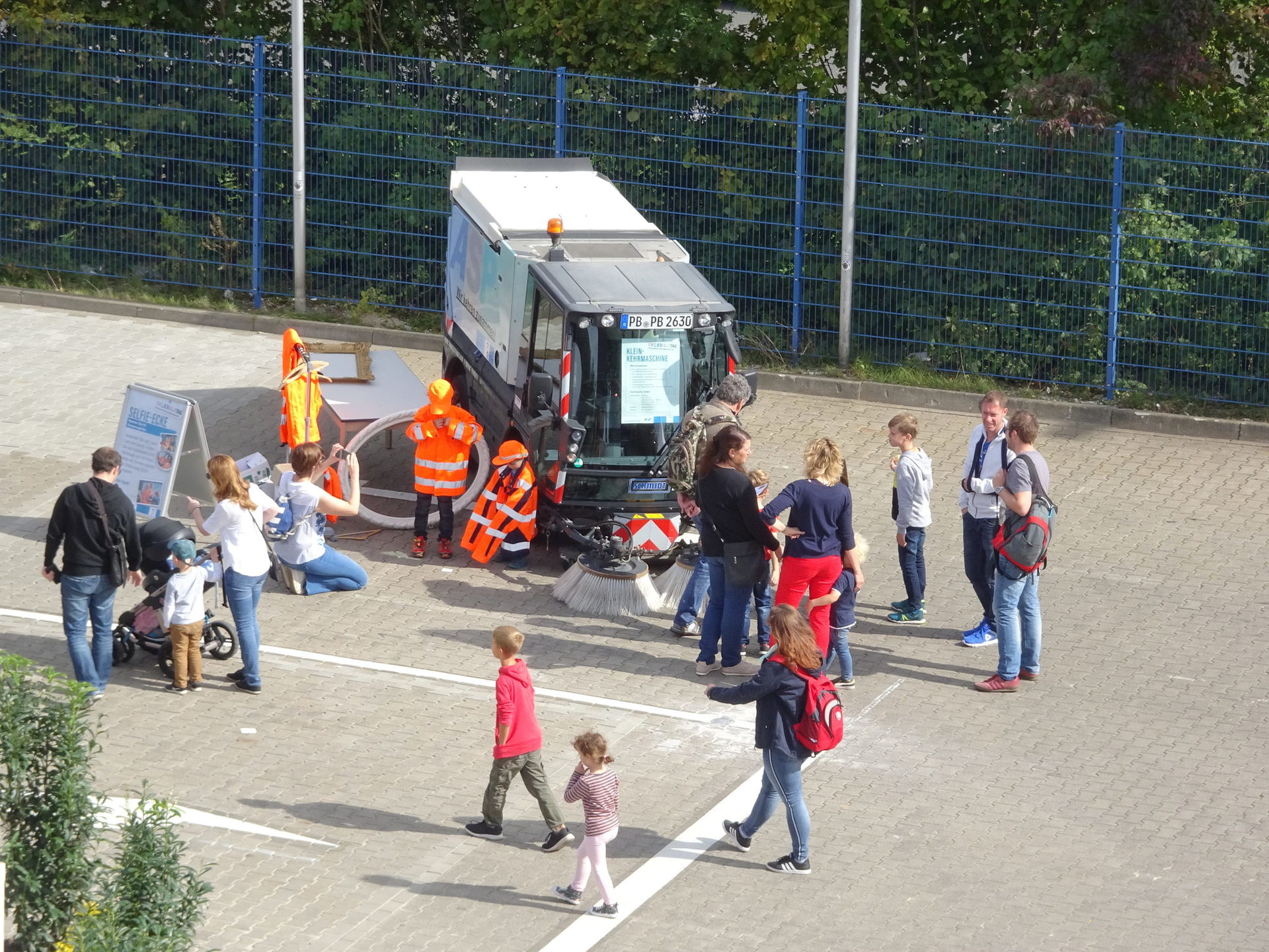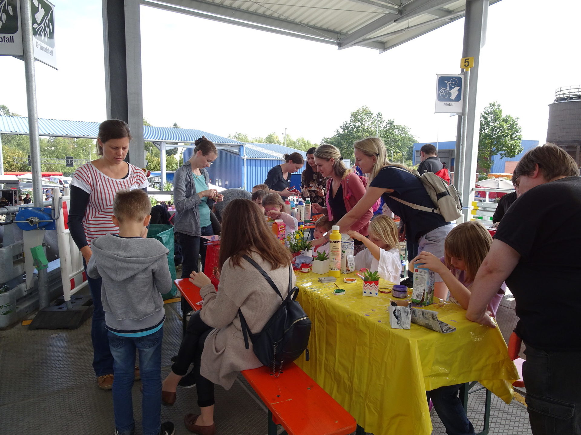 Die Kleinen freuten sich über eine Mitfahrt in der Kehrmaschine, am unermüdlichen Schnurren des Glückrades oder auch nur über das grenzenlose Buddeln in einem großen Sandhaufen. Ein schöner Erfolg war auch die Upcycling Bastelaktion: Die vorher gesammelten Getränketüten waren schon um 14 Uhr zu Vogelhäuschen und Blumentöpfen aufgewertet worden.