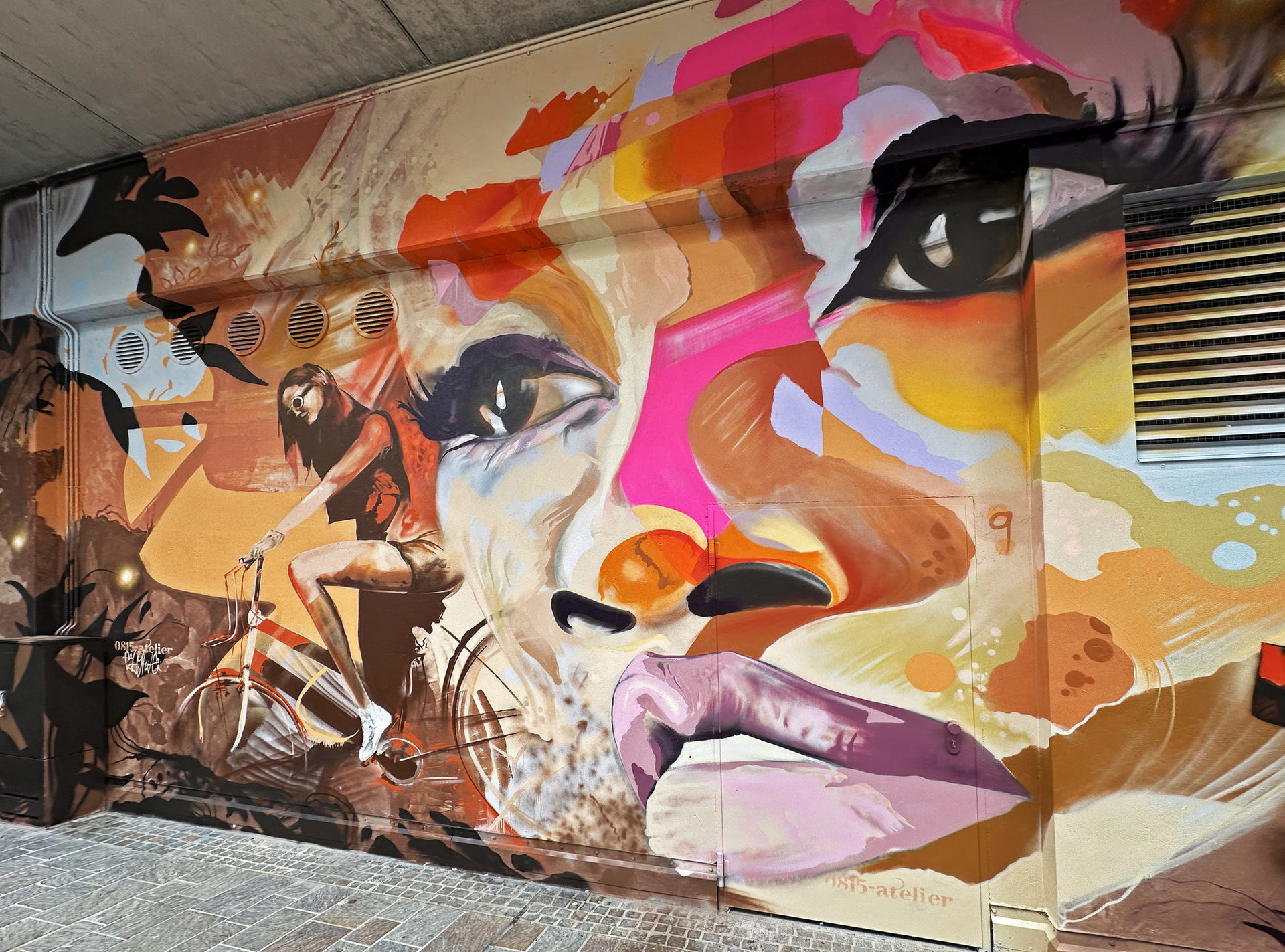Das zweite Graffiti ist an der Fassade zwischen Broers und dem Rewe-Markt entstanden. Der Paderborner Künstler Edwin Bormann setzte in seinem Werk den „Fluß der Menschen in die City“ eindrucksvoll in Szene. Ein großes Frauengesicht zieht sofort alle Blicke auf sich. Die harmonische Farbauswahl hat die ehemals unscheinbare Wand in einen lebendigen Ort verwandelt.