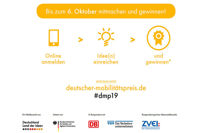 Digital, sozial, nachhaltig: Welche Ideen würden die Mobilität in Ihrem Alltag verbessern? Kreative Antworten auf diese Frage können Bürgerinnen und Bürger bis zum 6. Oktober 2019 auf dem Onlineportal des Deutschen Mobilitätspreises einreichen. Alle Teilnehmer haben die Chance auf Preisgelder im Gesamtwert von 6.000 Euro. Die drei Gewinner werden im November bei einer feierlichen Preisverleihung durch die Wettbewerbsinitiatoren, dem Bundesministerium für Verkehr und digitale Infrastruktur (BMVI) und der Initiative „Deutschland - Land der Ideen“, geehrt.